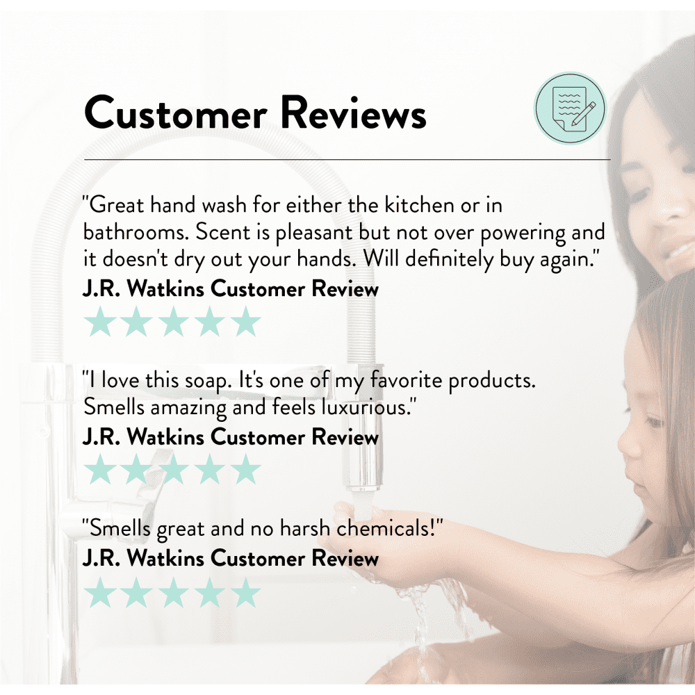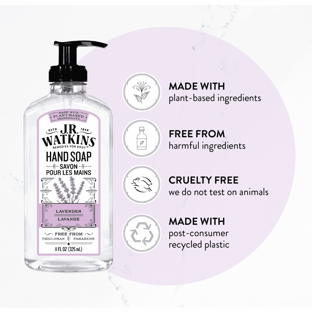 J.R. Watkins Gel Hand Soap is a non-drying gel hand soap that works into a soft lather for clean, freshly scented hands. This gel hand soap is made with plant-based pure ingredients, so there are no harsh chemicals that may leave your feeling hands dry or rough. Simply run your hands under warm water, pump desired amount of soap onto hands, lather for 30 seconds, rinse off, and dry for pleasantly-smelling clean hands. J.R. Watkins Gel Hand Soap is available in many fresh scents including: Aloe & Green Tea, Coconut, Grapefruit, Lavender, Lemon, and more. At J.R. Watkins we aspire to set your body & spirit right with our line of products made with natural ingredients that have stood the test of time for 150 years.