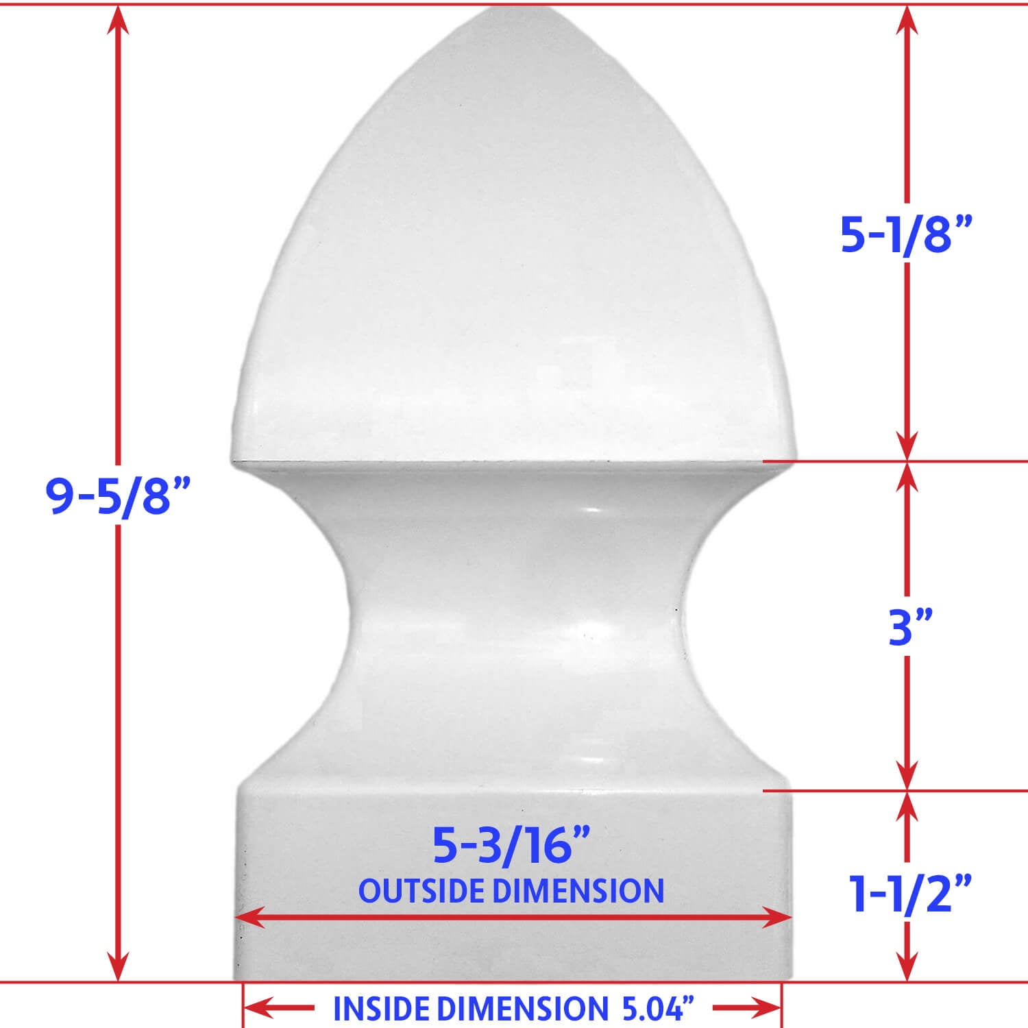 - Inside Vinyl/PVC Post Cap Dimensions are 5.04" x 5.04" and is a Sharp Corner Radius. 5" Gothic Cap