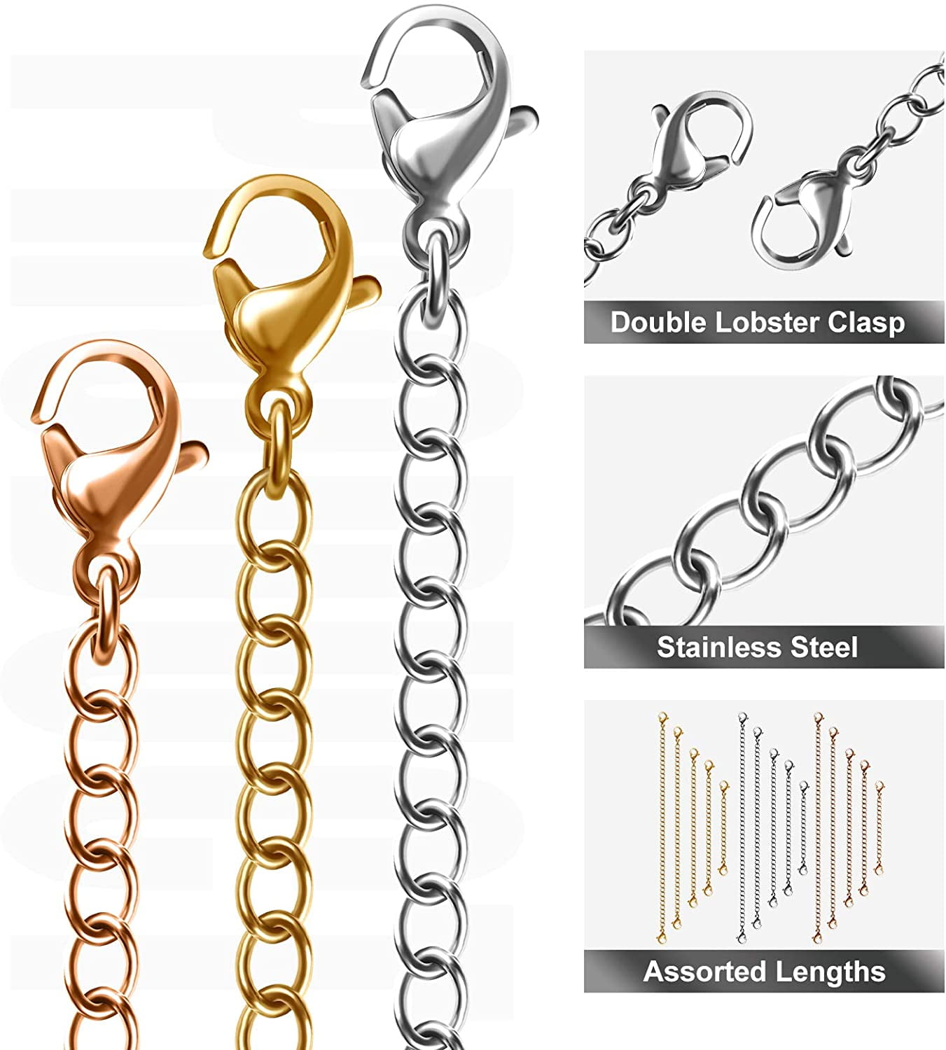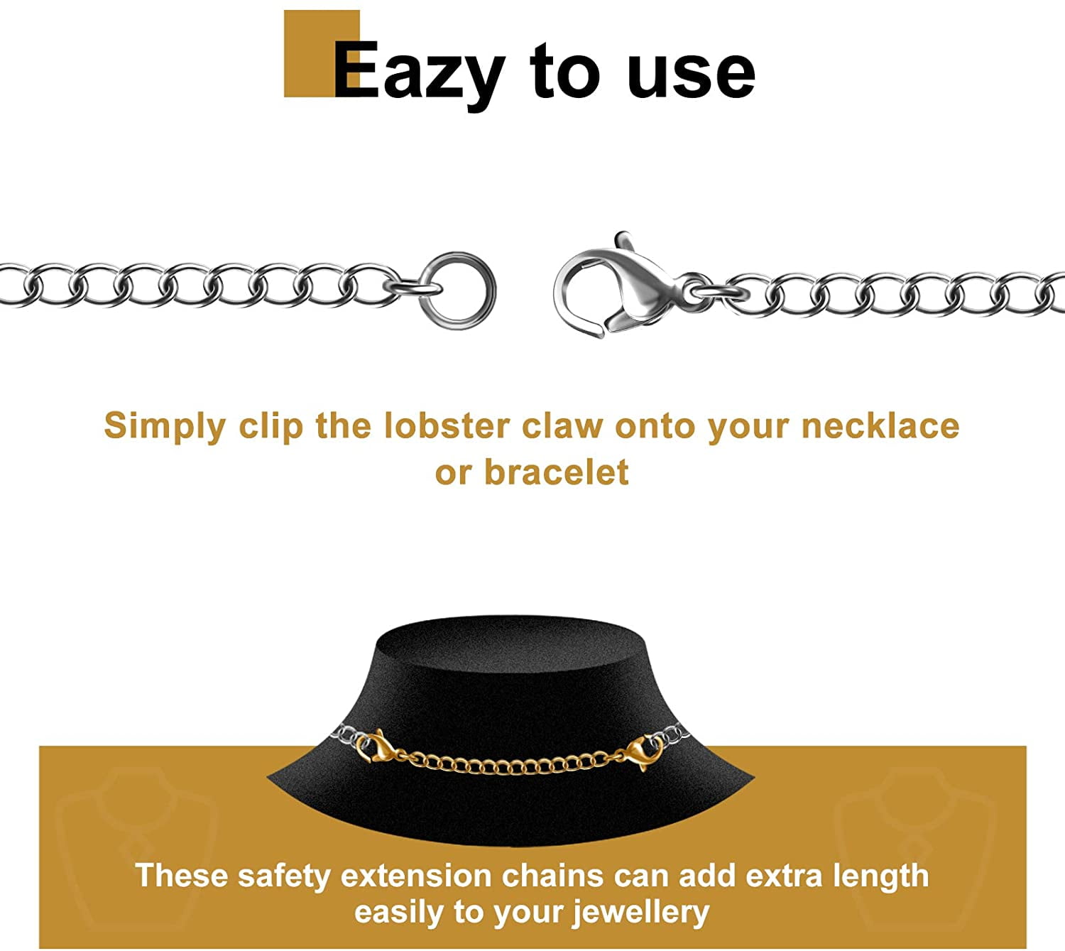 These safety extension chains can add extra length easily to your jewellery, such as your chains, necklaces, bracelets, anklets or chokers, make them achieve your desired lengths and more suitable for you . Our men necklace extenders designed with double classic lobster claw clasps, which can clasp the ends of your necklace closely and easy to put on and take off . The necklace extend chains can be used in necklace, bracelets or jewellery making. Jesot necklace length extender is made of premium quality stainless steel. High tarnish resistance, strong and durable, bright and delicate