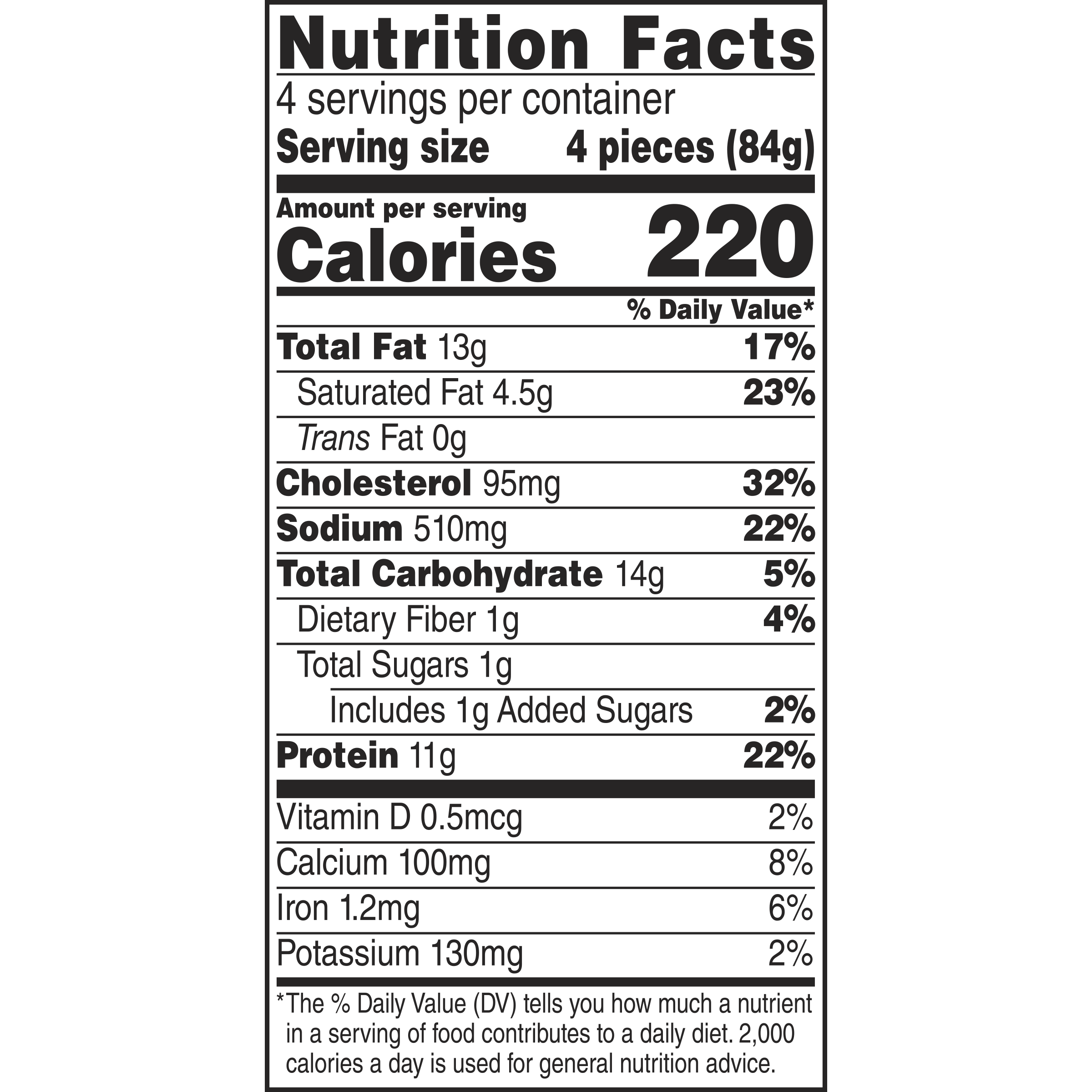 - Contains 11 grams of protein per serving, serving size 4 pieces