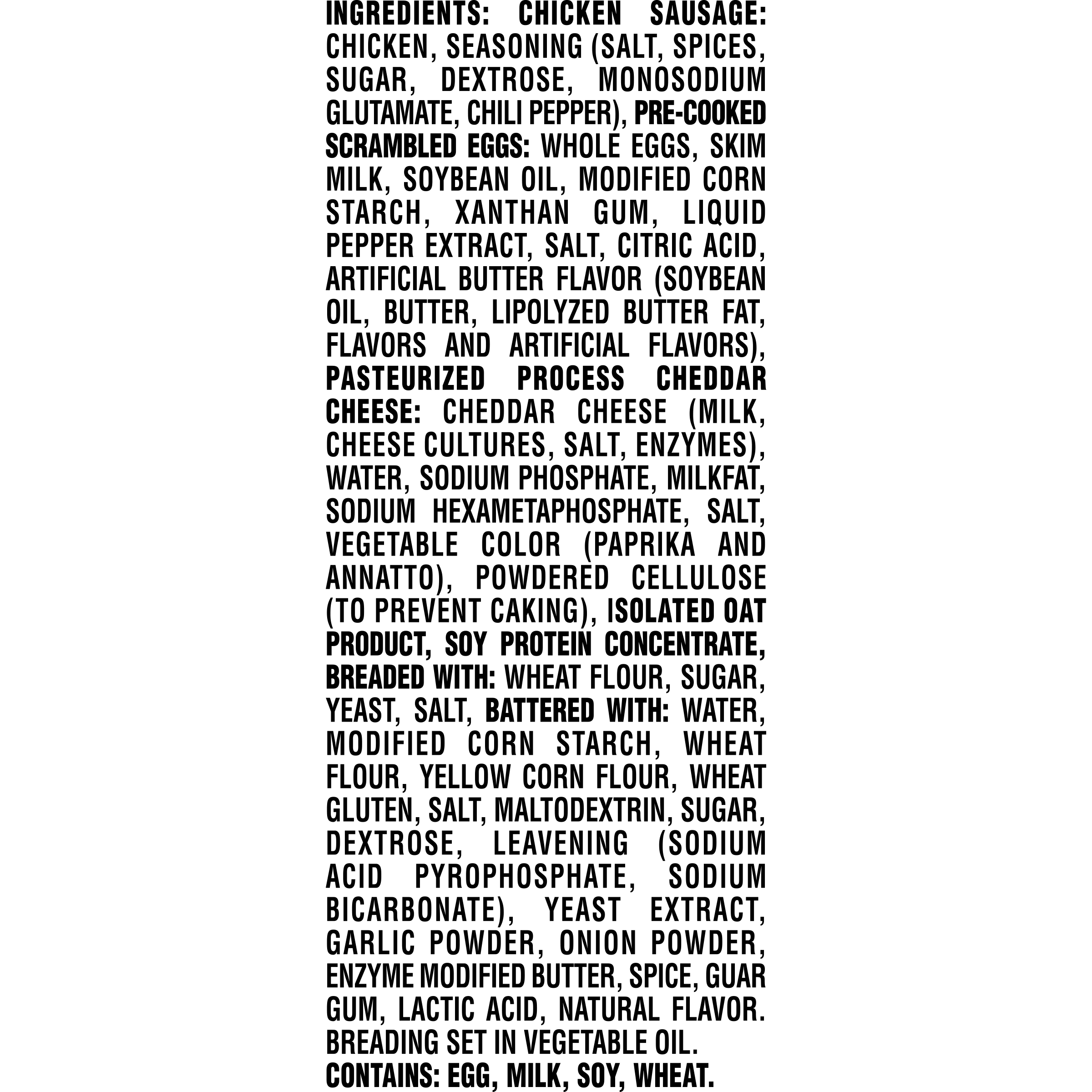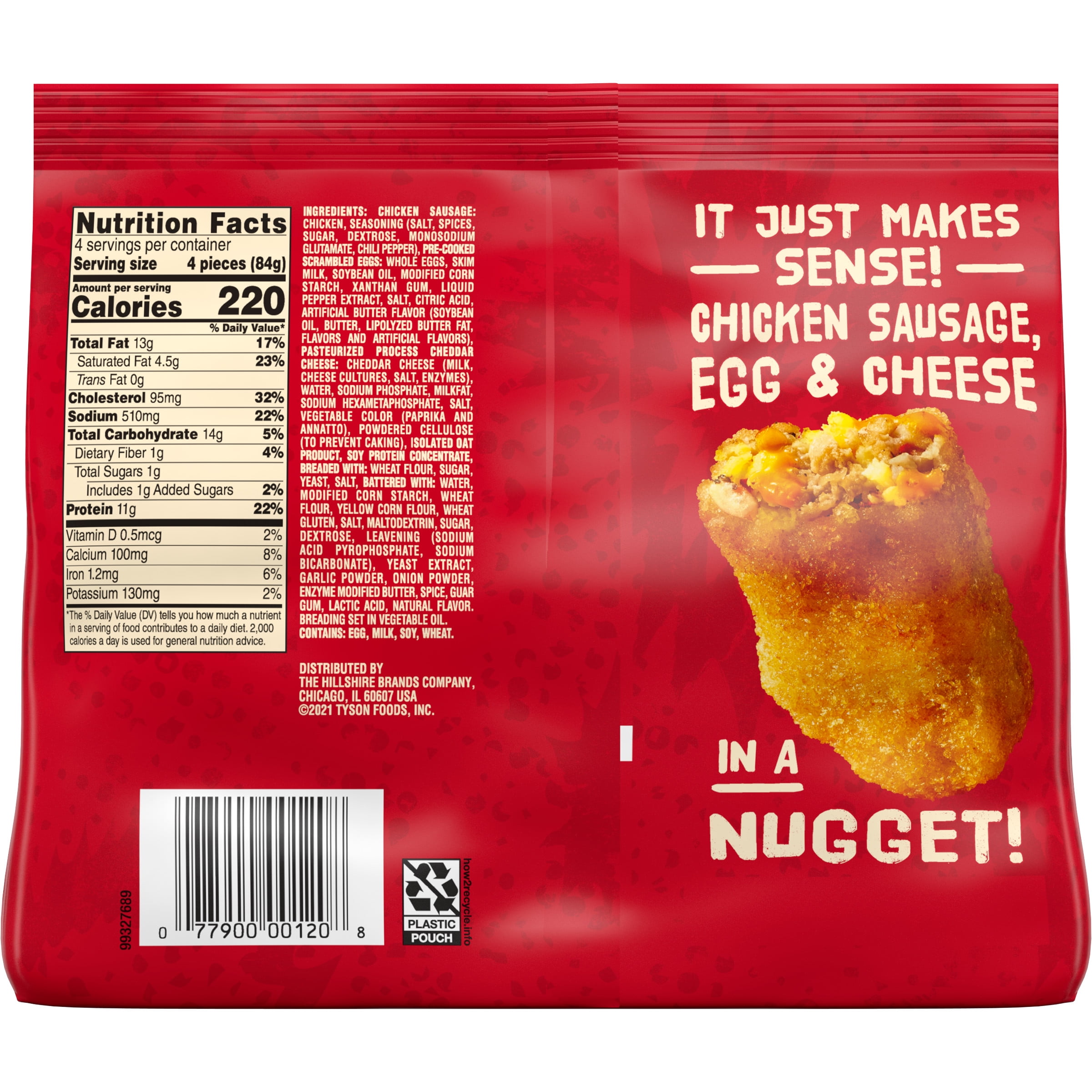 - Breaded nugget shaped patties stuffed with savory chicken sausage crumbles, scrambled eggs and cheese