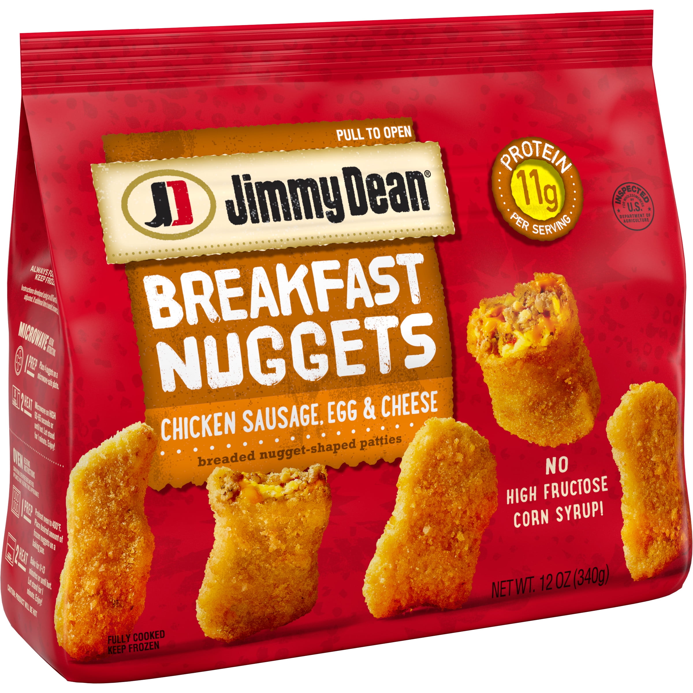 Savor all the flavors of a sit down breakfast any day of the week with grab and go Jimmy Dean Breakfast Nuggets Chicken Sausage Egg and Cheese. This fun new twist on a family favorite delivers premium, seasoned chicken sausage, scrambled eggs and cheese stuffed in lightly breaded bite sized nuggets. Perfect for busy mornings, these car friendly heat and eat nugget shaped patties are fuss free finger food for folks on the go. Made with no high fructose corn syrup and ready from the microwave in under 2 minutes, our fully cooked bites contain 11 grams of protein per serving. For a quick and delicious morning meal, heat and serve with a side of fresh fruit or yogurt. Includes one 12 oz resealable package of breaded nuggets. Jimmy Dean Brand brings you many ways to add some sunshine to your morning. Because today’s your day to shine on.