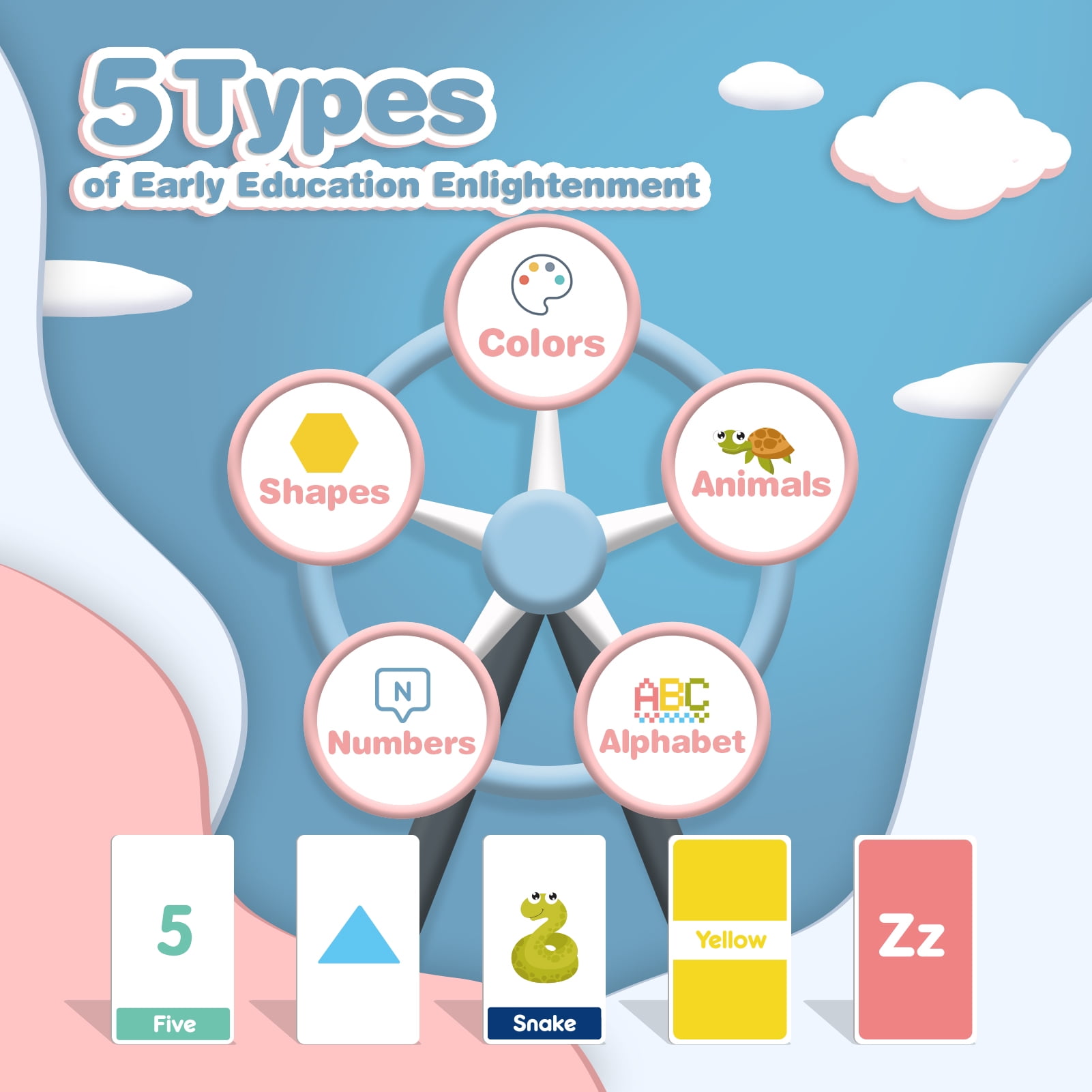 - 58 Educational Flash Cards include 10 numbers, 26 letters, 12 shapes, and 10 colors.