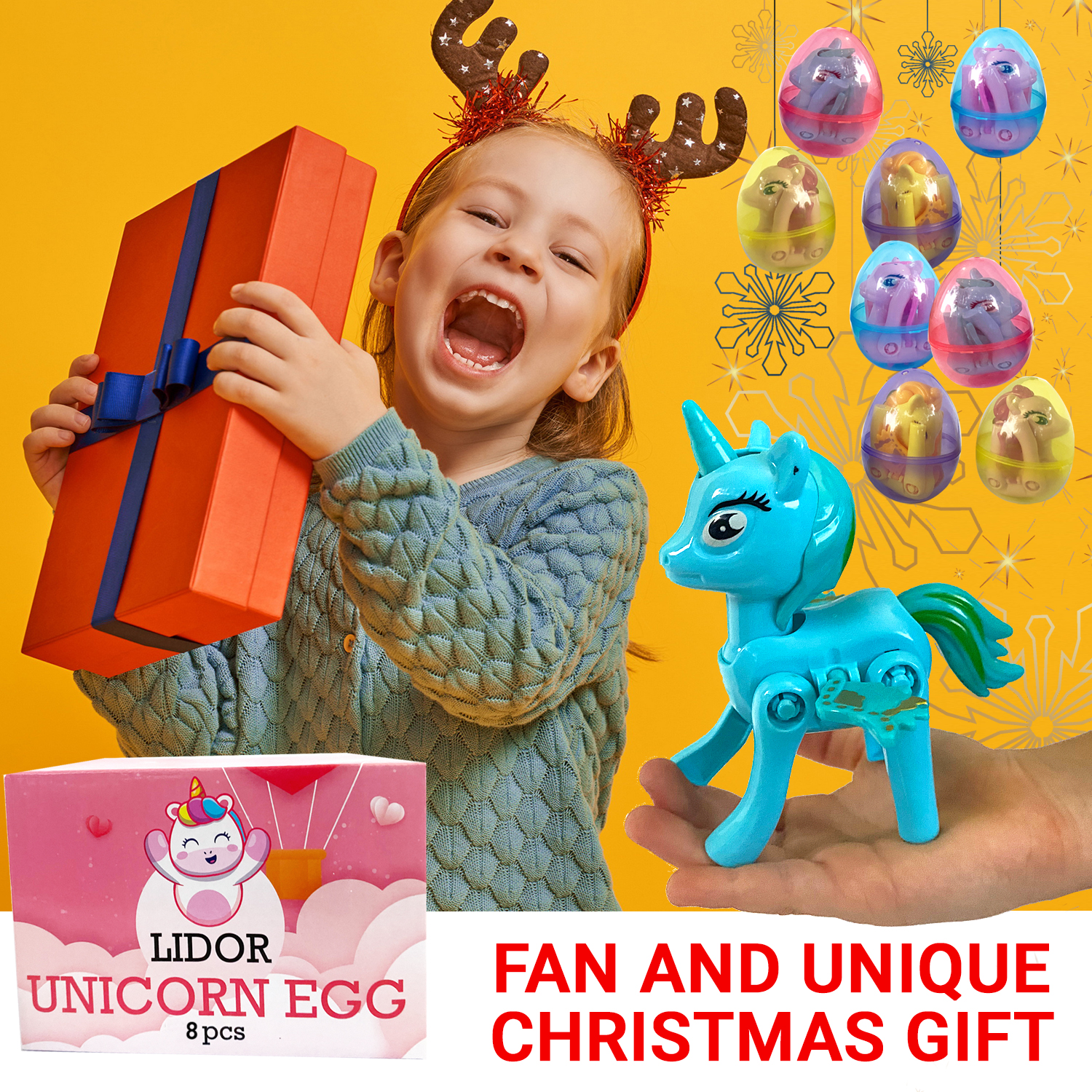 Unicorns Surprise Eggs with Toys Inside Easter Stocking Stuffers Gifts for Girls and Boys Unicorn Pack of 8 Jumbo 4 pack prefilled eggs in a colorful gift box. Each unicorn deformation egg contains a foldable cute unicorn toy. Legs, head, rainbow horn and tail are movable. 2 detachable fairy wings enhance the fun even more. Tiny toys can be easily fold to fit back into eggs after play. Cool collection for all fans of unicorns.