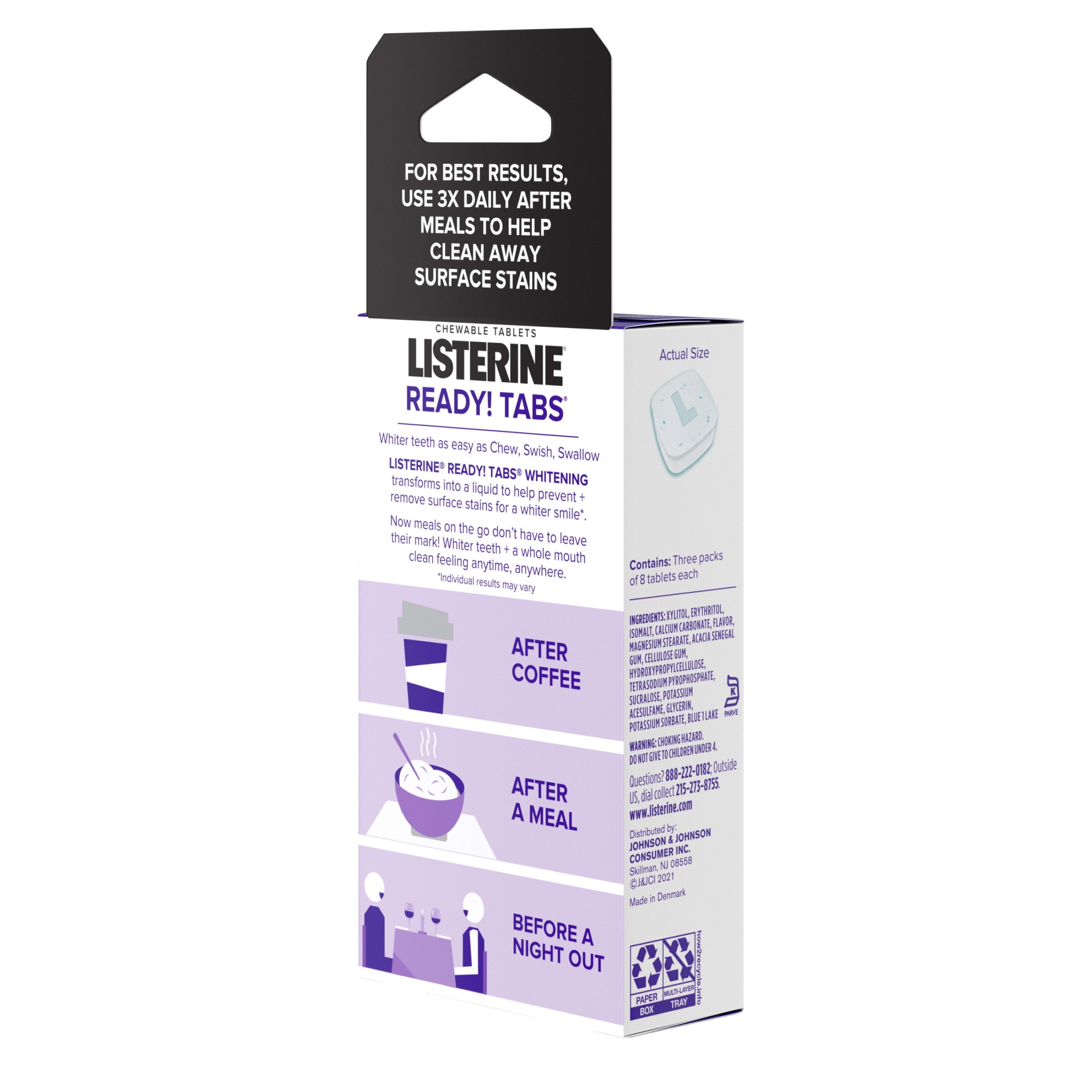 Unleash the clean feeling of LISTERINE on the go with LISTERINE Ready! Tabs Whitening Chewable Mint Tablets. These revolutionary chewable fresh breath tablets transform from solid to liquid within seconds of chewing, helping whiten teeth, fight bad breath germs and leave your mouth feeling as clean as brushing. Just chew to activate, swish to clean, swallow and go! Sugar-free, alcohol-free & kosher, the whitening tablets are clinically shown to reduce stains to whiten teeth while helping prevent new stains from forming after food and drink such as coffee and tea. The tabs also neutralize odors to provide noticeably fresh breath for up to 4 hours – anytime, anywhere. Available in refreshing Polar Mint flavor, they offer whiter teeth in 1 week and work harder than gum and mints to freshen breath, making them a great choice any time you want that "just brushed" clean feeling. Whitens by preventing and removing stains. Use 3 x/day after meals. Individual results may vary