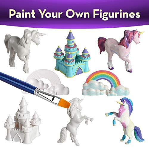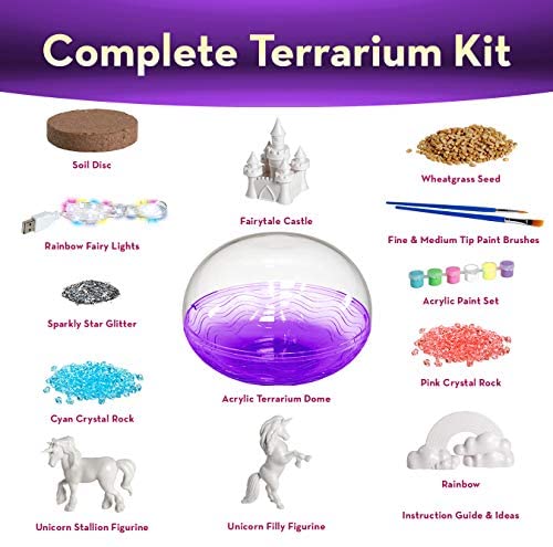 - ALL INCLUSIVE KIT – Comes with everything needed to create, grow and cultivate your very own mini unicorn habitat. 1 Terrarium Dome (bowl and lid) – 2 Unicorn figurines – 1 Castle – 1 Rainbow – 1 Soil Disk – 1 Pack of Wheatgrass Seeds – 2 Colors of Acrylic Garden Stones (Pink and Blue) – 1 Acrylic Paint Set with 6 different Colors – 1 Fine Tip Paint Brush – 1 Medium Tip Paint Brush – Sparkly Star Glitter – 1 Set of Rainbow Colored Fairy Lights