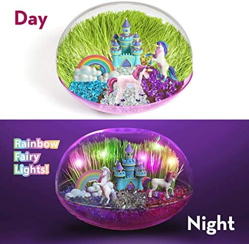 - RAINBOW FAIRY LIGHTS – Light up your magical unicorn habitat! Each kit comes with its very own enchanted string of rainbow colored LED fairy lights, allowing your child to sprinkle their imaginary world with light, while illuminating the real world around them. Let the imagination of your girl or boy shine bright through the night with the Little Growers light up terrarium kit for kids