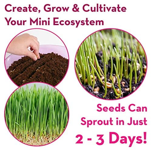 - CREATE AND GROW A MINI ECOSYSTEM – The fun doesn’t stop after building your terrarium. Now comes the fun part…caring for and cultivating your very own mini ecosystem! Your child will be learning the science and skills of planting and nurturing their garden. Using the soil and seeds provided, your child will be planting, watering, gardening and growing in no time. Your wheatgrass seeds can begin to sprout within 2-3 days! It’s the perfect STEM toy or gift for girls and boys any age