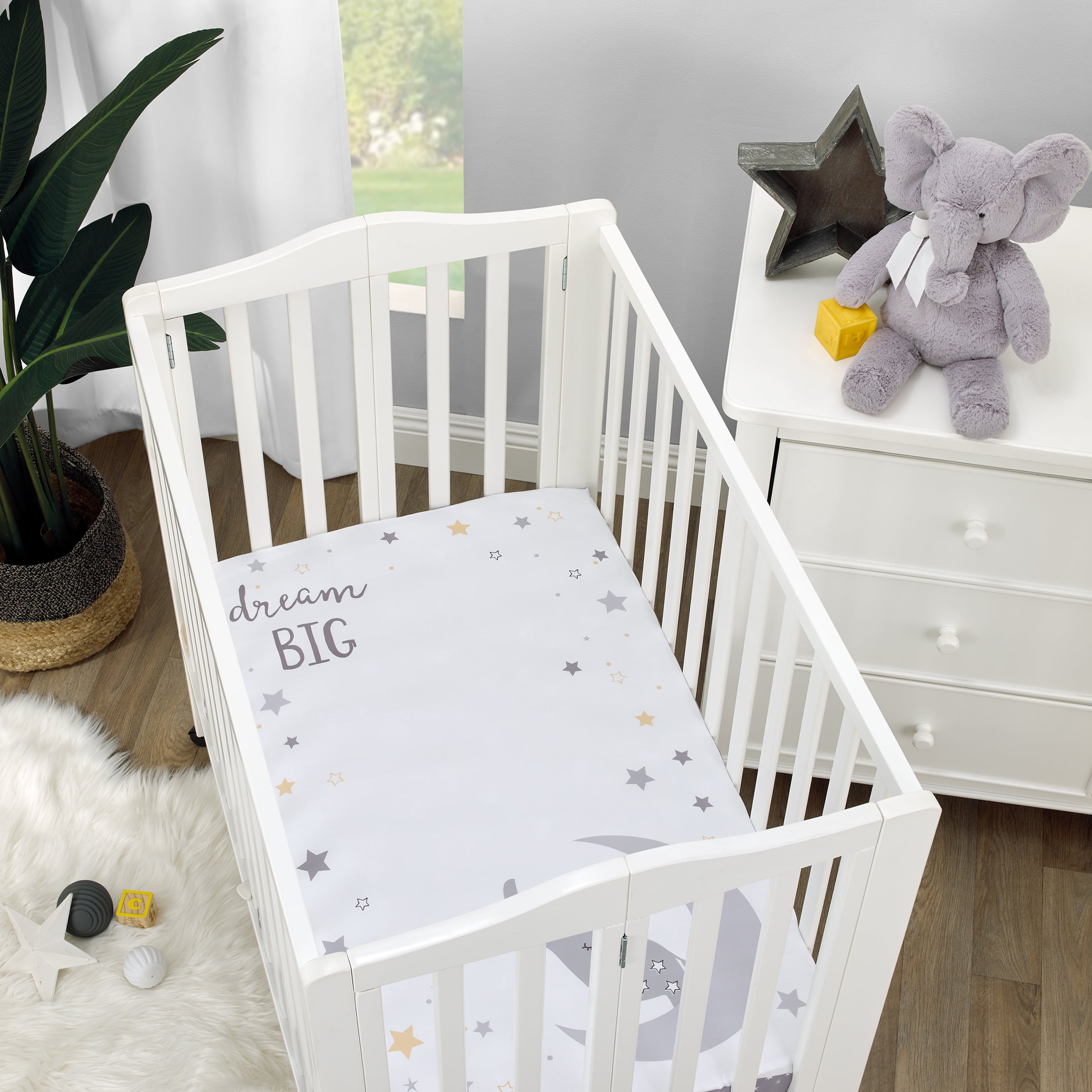 The Little Love by NoJo Dream Big Photo Op Fitted Mini Crib Sheet is designed to create the perfect photo opportunity by capturing baby’s milestones and special moments. Featured in soft grey and white with a baby elephant sitting on a crescent moon among the stars. With encouraging words that say "Dream Big". Measures 24" x 38" x 5" and fits a mini crib mattress. Machine washable for easy care! Made from super soft cozy fabrics for a peaceful night’s sleep.