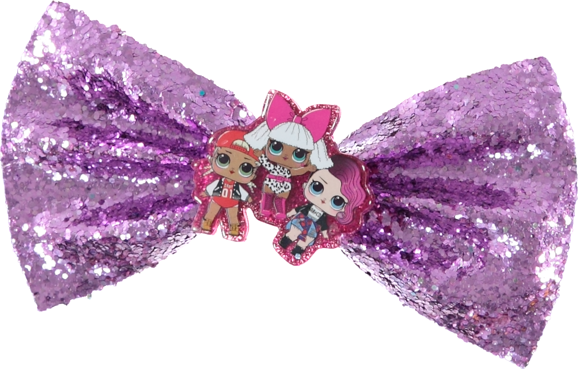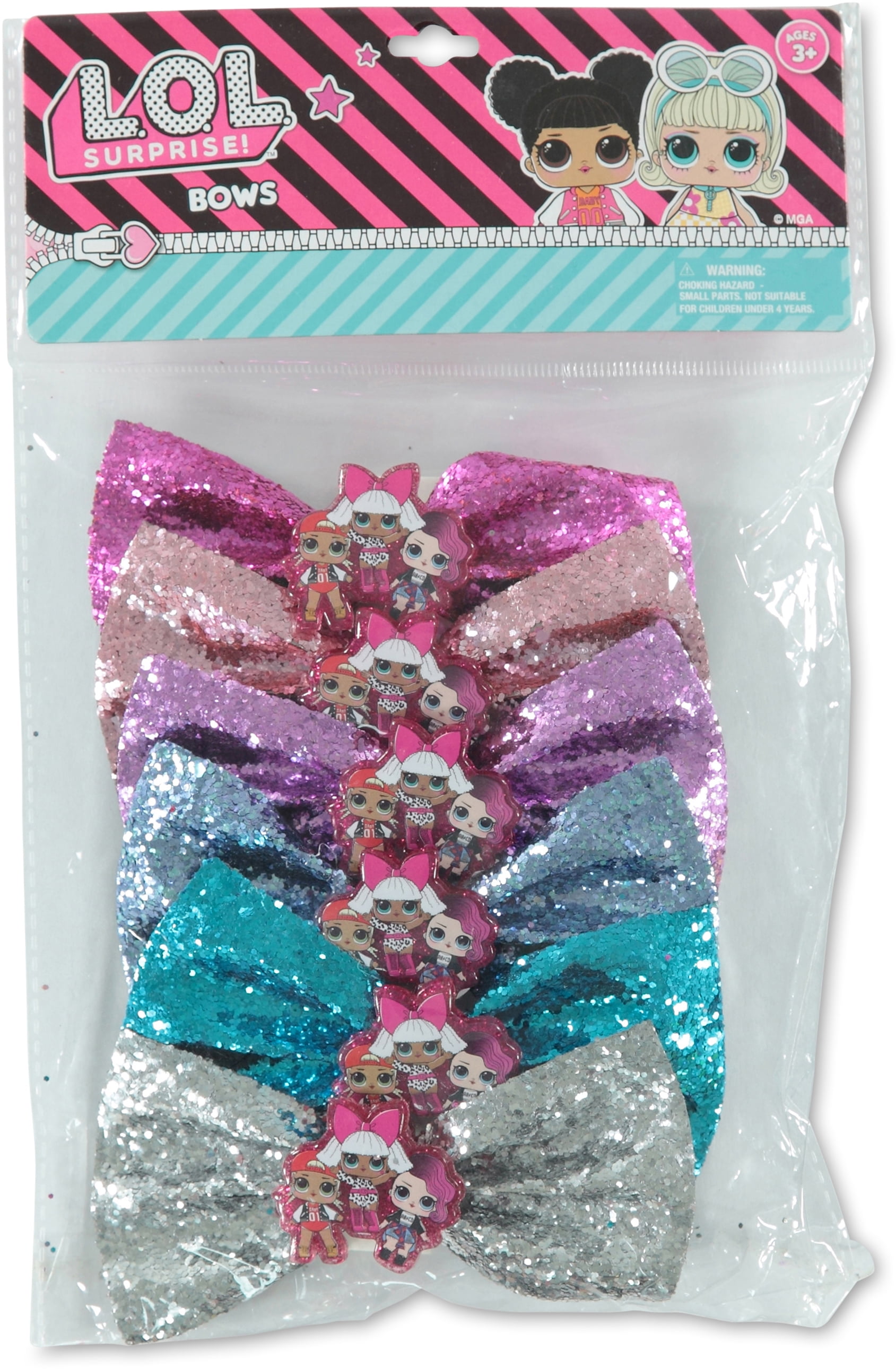 LOL 6PK GLTTR BOW comes with 3 of your favorite characters featured on the charms. Each bow has a salon clip closure.Heavy Sugar Glitter bow with printed charms 6 pieces salon clip closure