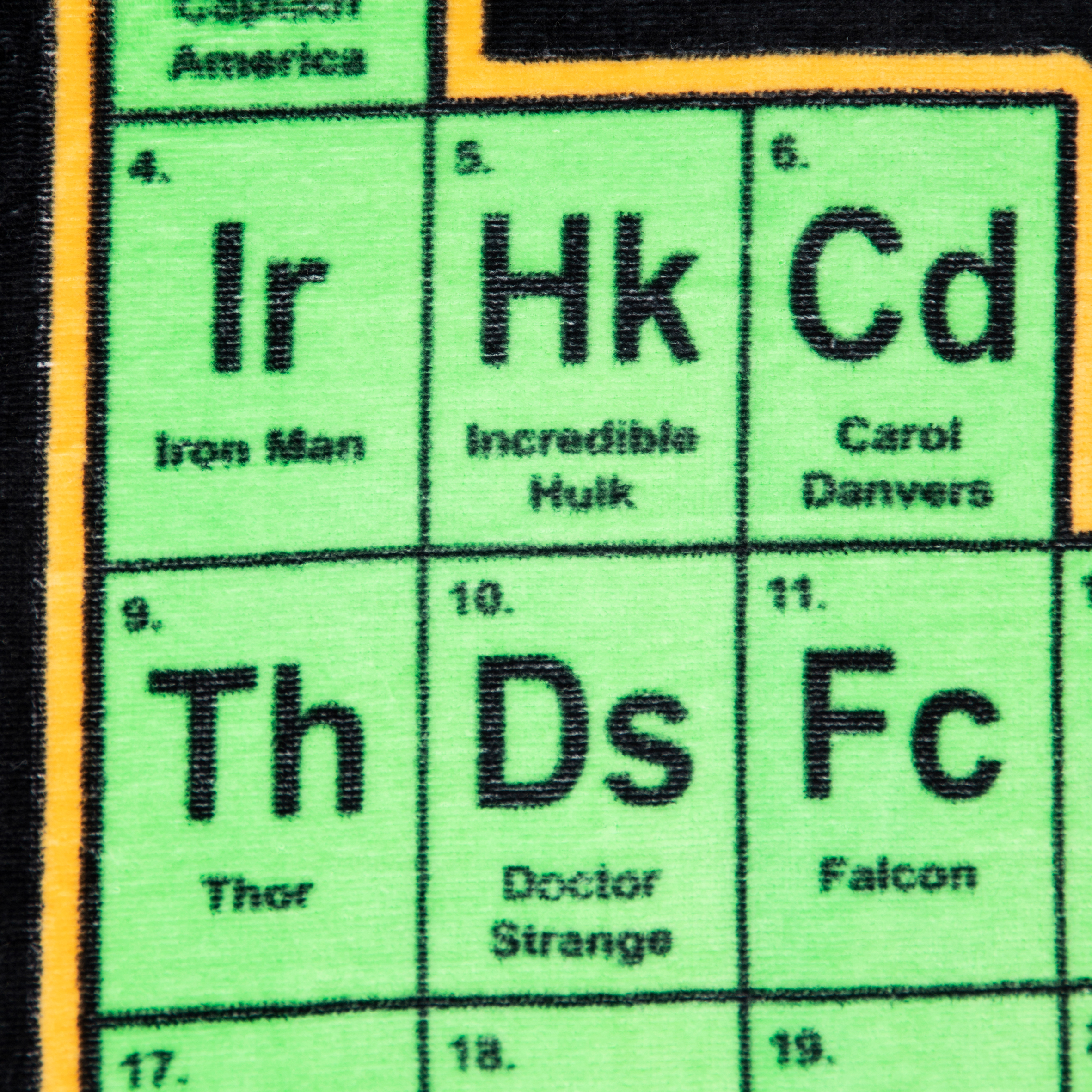 - Features all of your favorite Marvel superheroes in periodic table form including Hulk, Captain America, Iron Man, Thor, Black Panther, and more