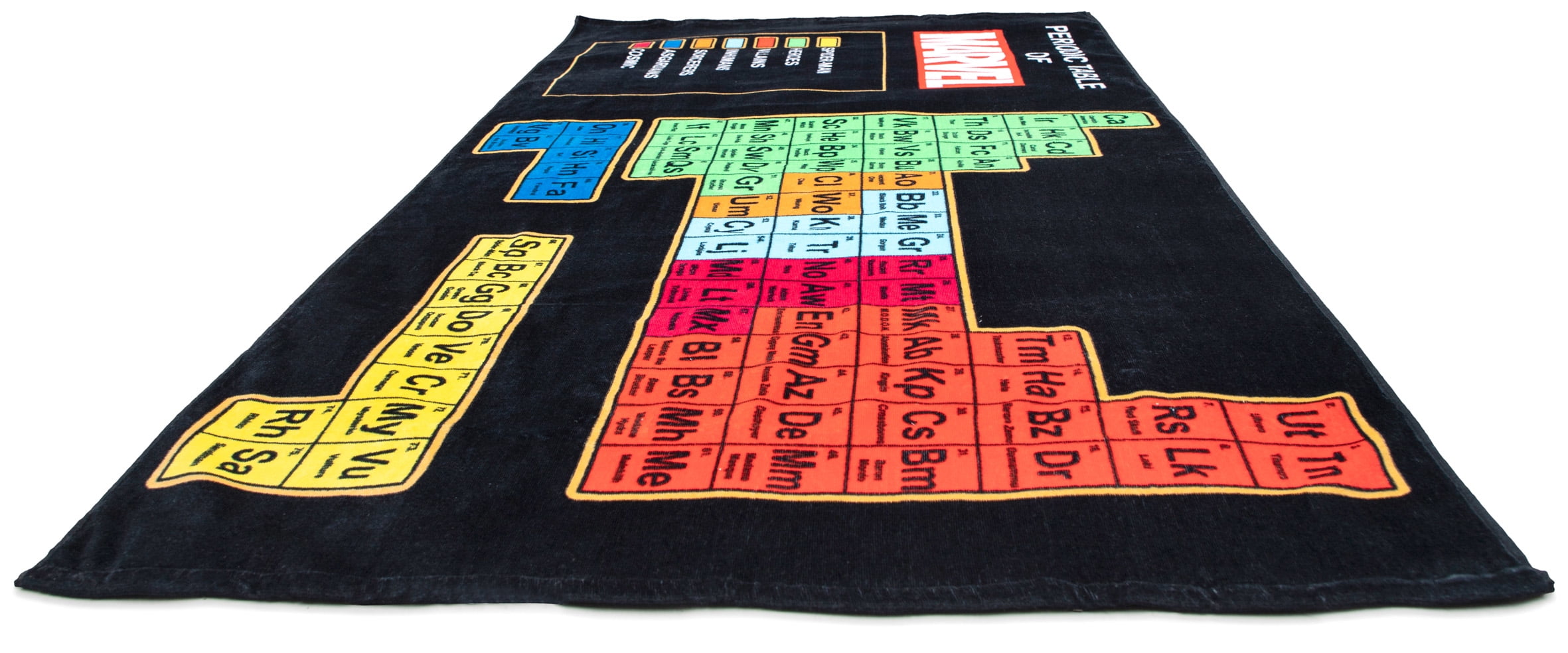 Science and superheroes come together on this Marvel Periodic Table Large Bath/Pool/Beach Towel- Super Soft & Absorbent Fade Resistant Cotton Towel. This cozy towel measures 34"x64", the perfect oversized size to use while lounging by the pool or at the beach. The printed cotton towel features a periodic table of superheroes and more from the Marvel comics. Some included are Iron Man, Captain America, Thor, Hulk, Black Widow, Doctor Strange, Hawkeye, Loki, and more! Simple care instructions include machine wash cold and tumble dry low.Marvel Periodic Table Large Bath/Pool/Beach Towel: