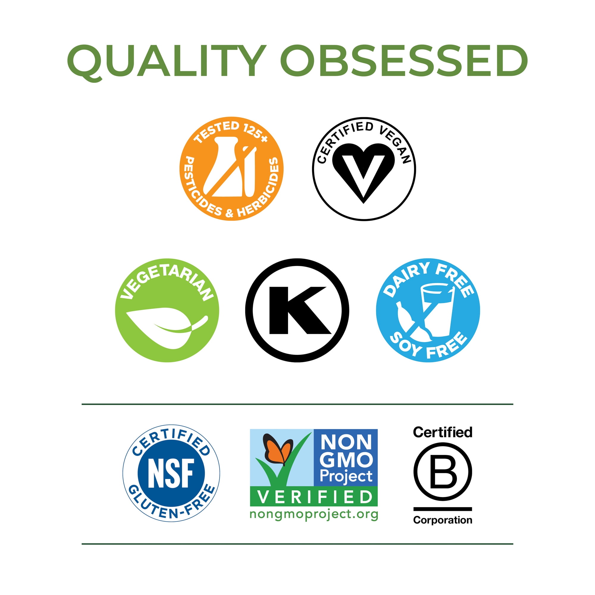 - Obsessed with Quality: Non-GMO Project Verified; Tested for over 125 chemical substances; Free of gluten, dairy, and soy; Certified B Corp; Certified Kosher