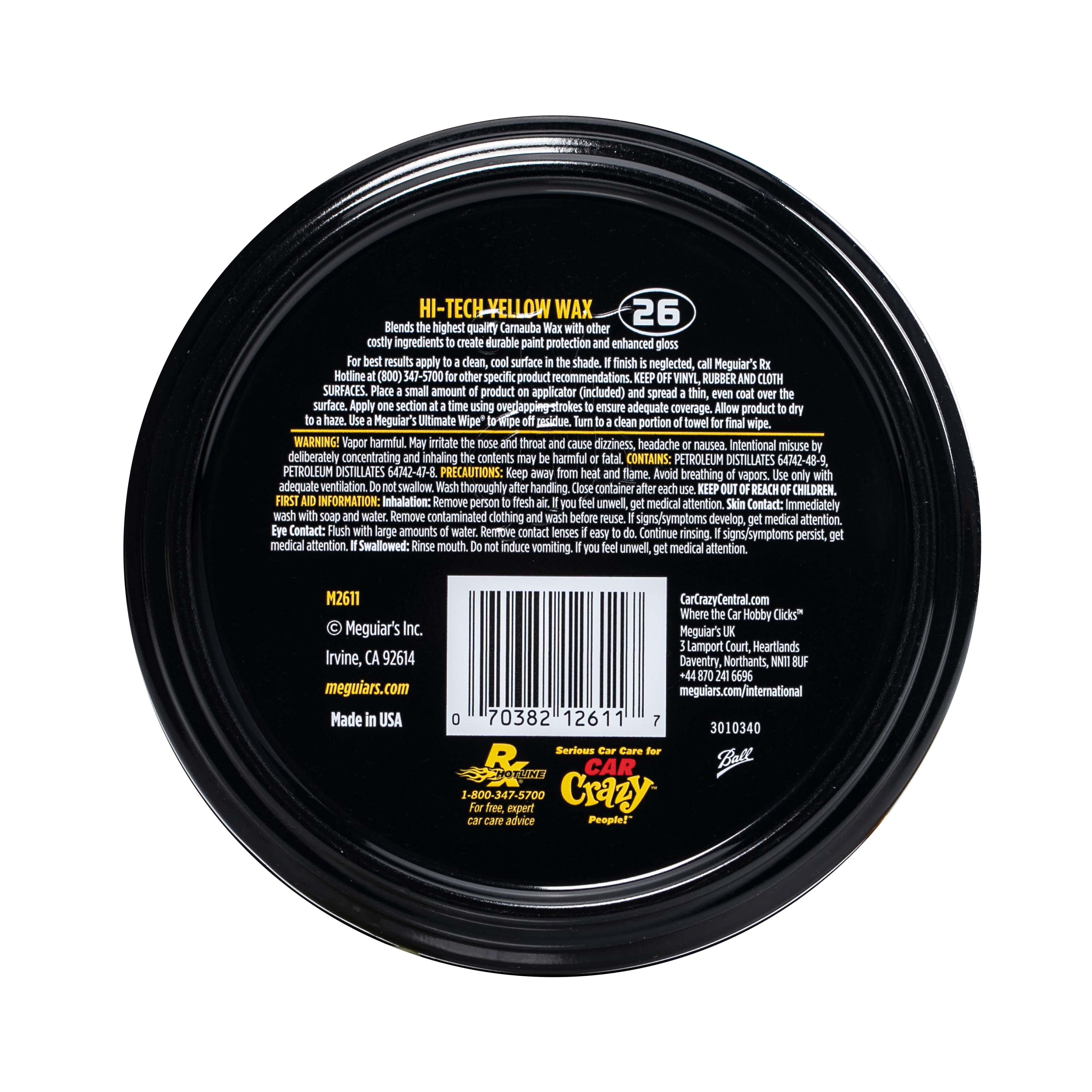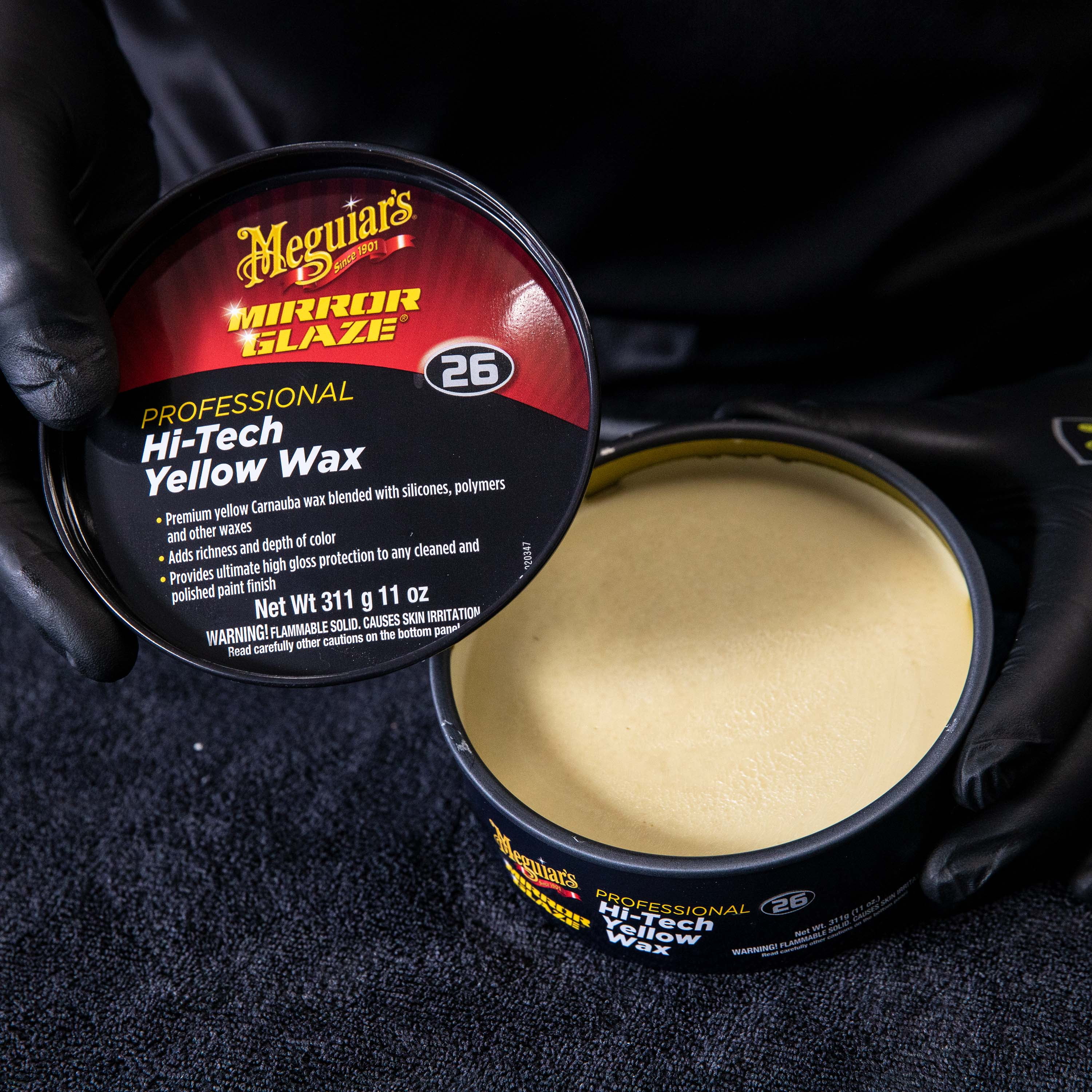 Meguiar’s M26 Mirror Glaze Hi-Tech Yellow Wax is a paste wax blended of premium carnauba wax, silicones, polymers and other waxes to give your finish durable paint protection and deep richness and color. Our professional-grade formula provides high shine wax protection to any cleaned and polished paint finish. Safe and effective on all glossy paints including clear coats. Formulated for use by hand. Includes a high-quality foam applicator pad. Also available in liquid form in 16 ounce and 1 gallon sizes.