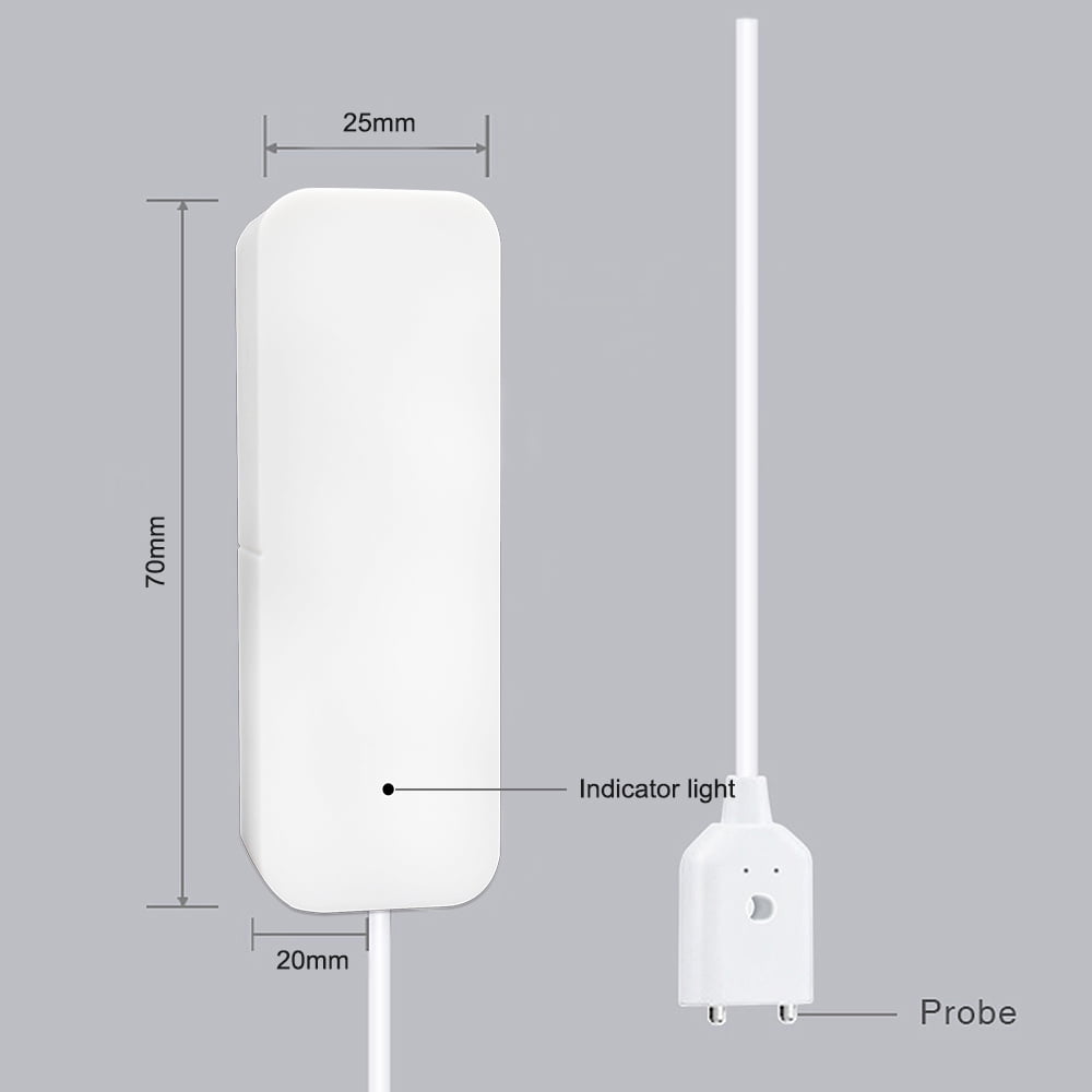 - 【Working Principle】When the two feet of the detector was immersed by the water, the alert notifications will be pushed to your phone, be aware of water overflowing in time, reducing flooding risk.
