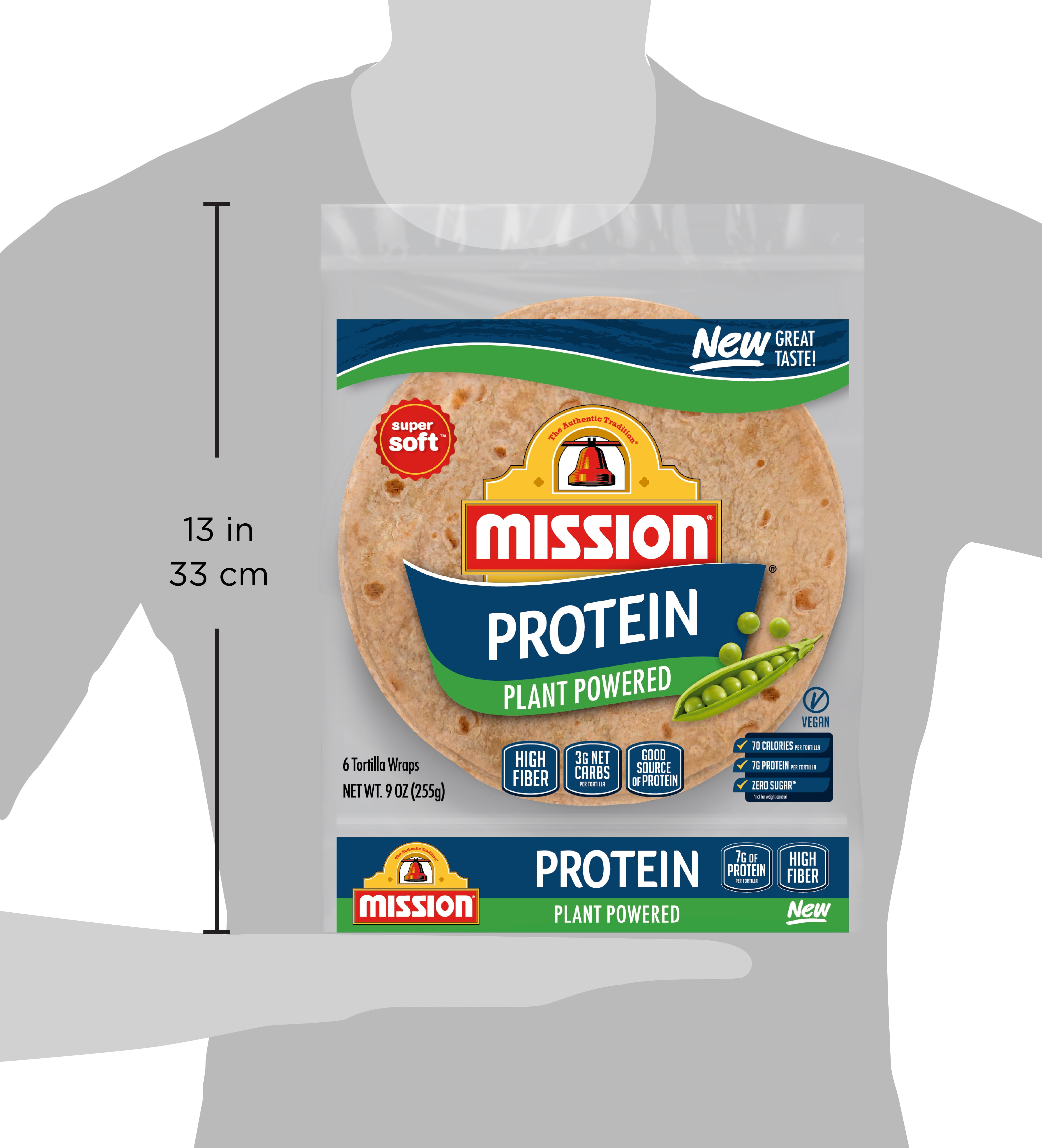 Mission Protein Tortilla Wraps are packed with plant-based pea protein a first for any flour tortillas on the market today. Our tortillas are also high in fiber and vegan friendly without sacrificing any of the great flavor you expect from Mission. Though our Protein Tortilla Wraps are versatile enough for all your favorite recipes, we recommend filling them with grilled salmon, capers, and cream cheese for a wholesome and satisfying lunch. Includes one 6 ct package of Mission Protein Tortilla Wraps.