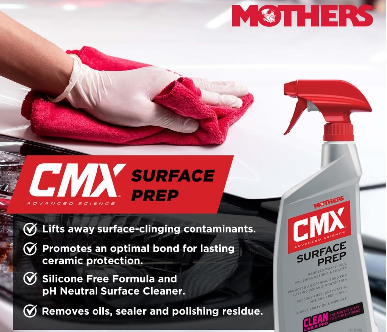 Proper surface prep before applying any ceramic coating, sealant or wax is paramount to ensure optimal adhesion a lasting bond and maximum shine. Old waxes, stubborn oils, grease, fillers and even that peskyu polishing residue are no match for CMX Surface Prep. Biodegradable grease-cutting surfacants and solvents dig deep, disolving oils and lifitng away surface clinging contaminants. This saafe but effective, pH neutral cleaner is so versatile it can be used on virtually every exterior surface of your vehicle including paint, glass, trim, wheels, tires and more. It can also be safely be used in body shop environments thanks to its silicone-free formula. Simply spray on and wipe off. CMX Surface Prep will do the rest, quickly flashing off, leaving a perfectly clean, residue free and anti-static, dust resistant surface, ready for coating.