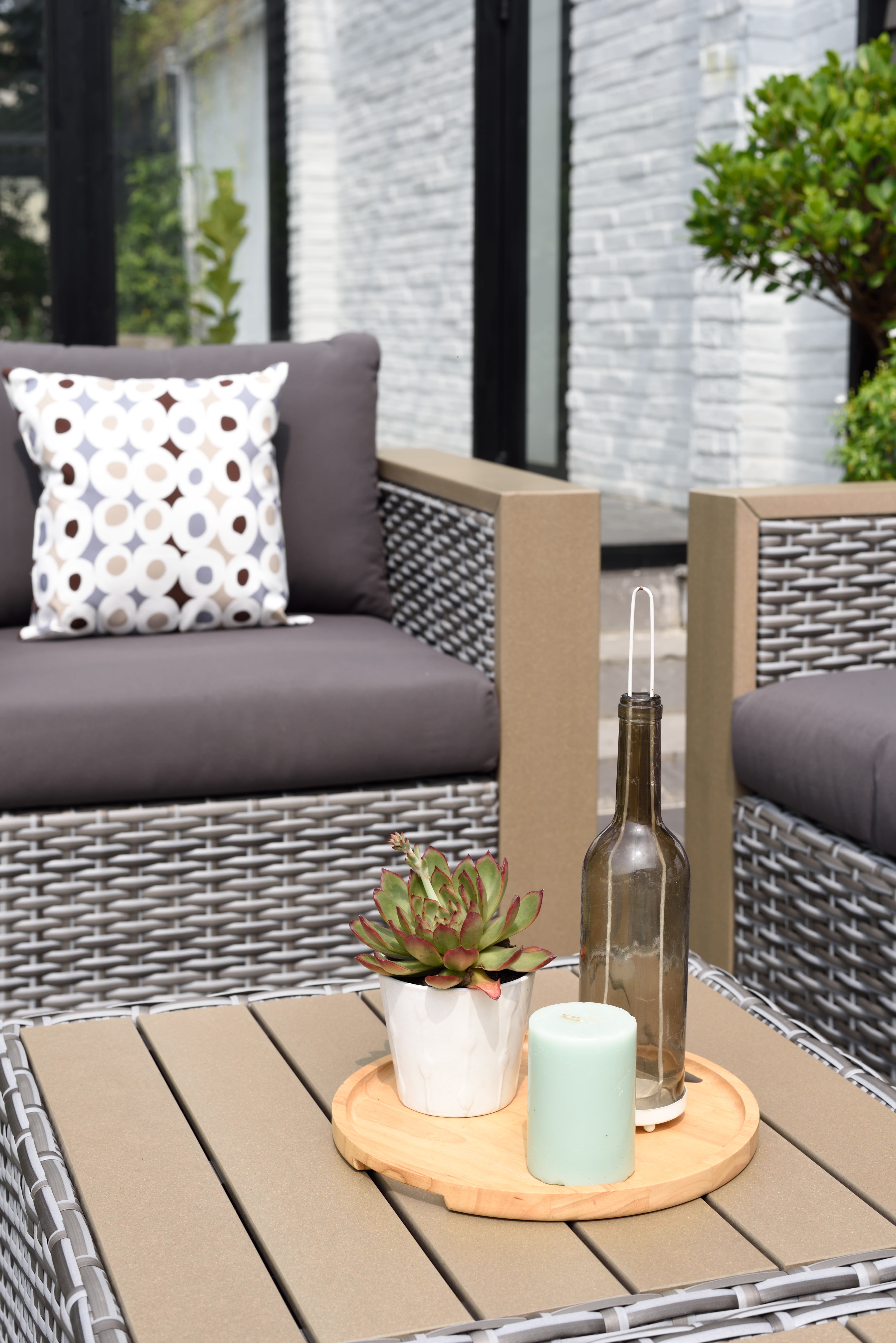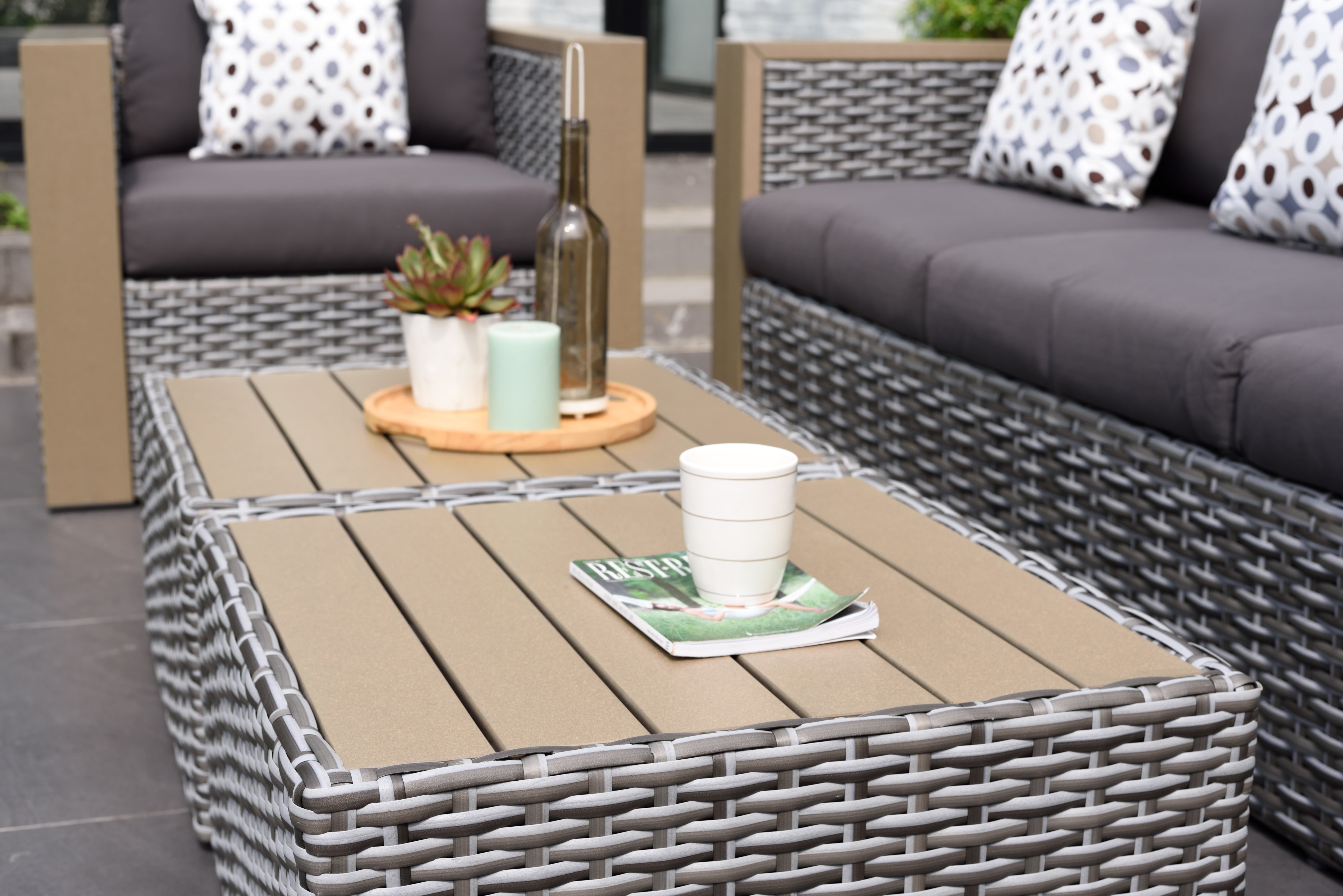 The Mustang Outdoor All-Weather 5-Piece Patio Conversation Set is made of high-quality grey synthetic wicker and aluminum frames and includes water-repellant cushions with a quick-dry feature. Combining class and elegance, this sectional set is ideal for both indoor and outdoor use. It is easy to assemble and you can move this lightweight set with ease. This 5-piece conversation set is resistant to harmful UV rays and a vinyl protector can be added as desired during the season to prolong durability. You can create a variety of seating arrangements using this conversation set that accommodates five people.