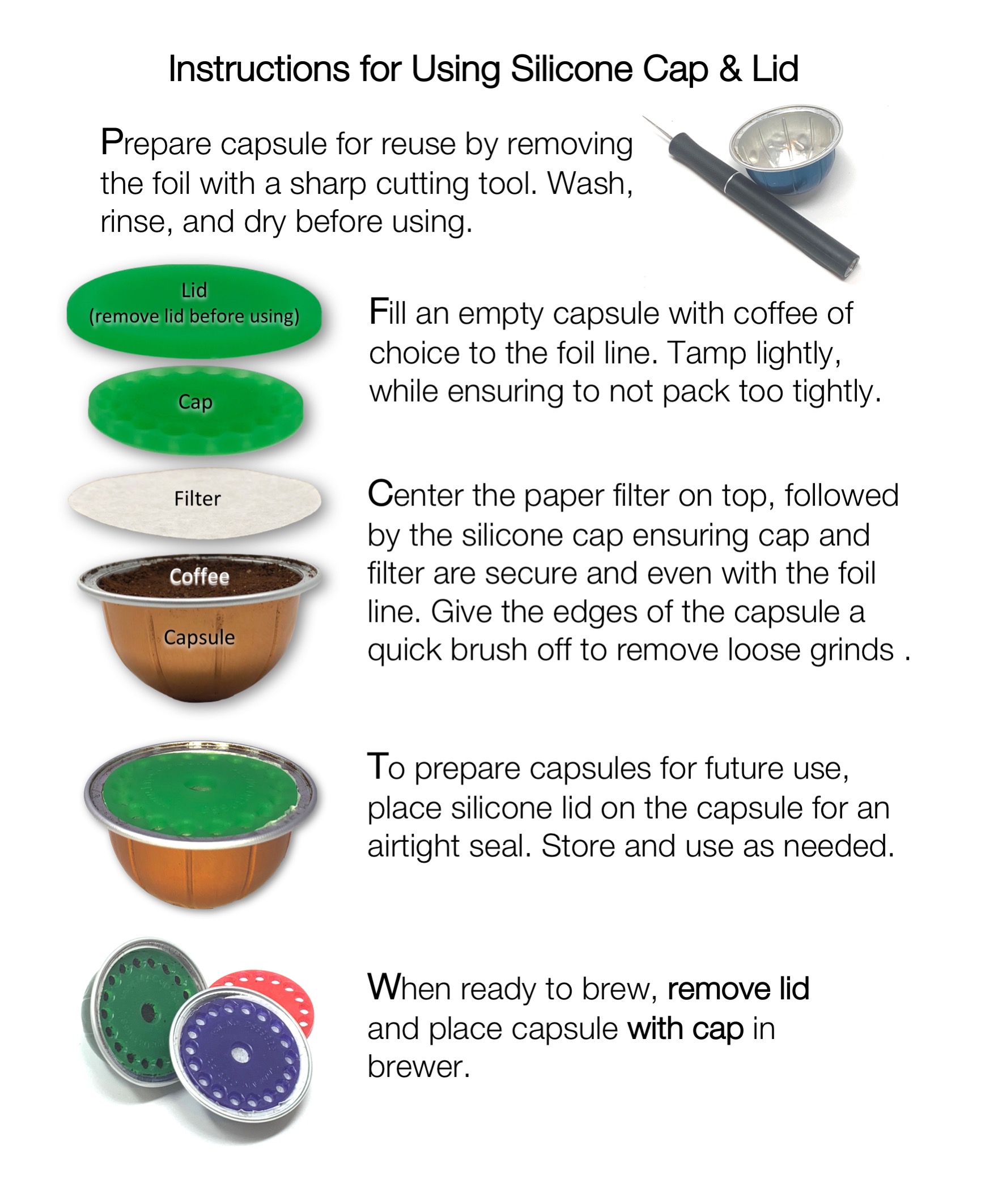 - INCLUDES: 1 reusable silicone cap and lid (color varies), 1 reusable polypropylene cap, 20 filters, 50 foil seals, 1 capsule holder and funnel, coffee scoop, cleaning brush, and instructions