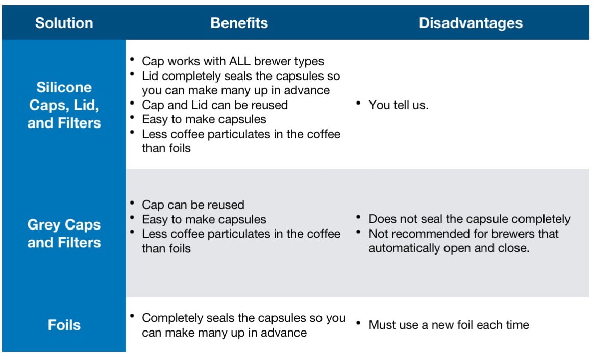 This product gives you the opportunity to sample all of our products that allow you to reuse the capsules of your choice for Nespresso® VertuoLine brewers with the coffee of your choice. Included is a holder and funnel with a scoop and brush to make filling capsules easy and mess-free. Foils work well for making capsules in advance and seal the capsule retaining the freshness of the coffee. The reusable silicone and plastic caps are great options that reduce waste by continuous reuse. Both types of caps can be sealed for future use as well with the silicone lid, sealing in freshness. This product is 100% Made in the USA! You can rest assured that our product is reliable and well made. NOTE: Includes solutions for ALL manual and automatic closing brewers. NOTE: Colors vary for the silicone cap and lid between red, green, and purple. Protected under Patent Number D839668