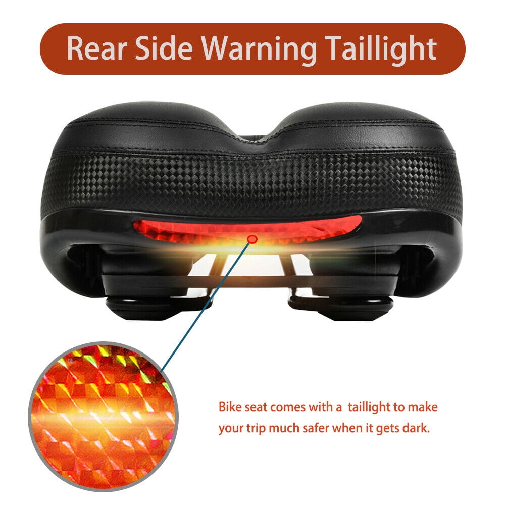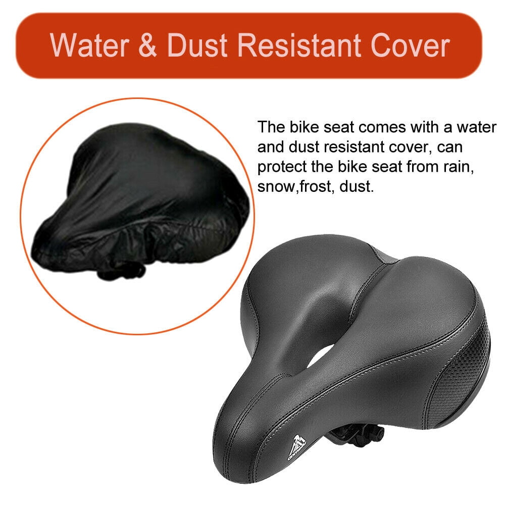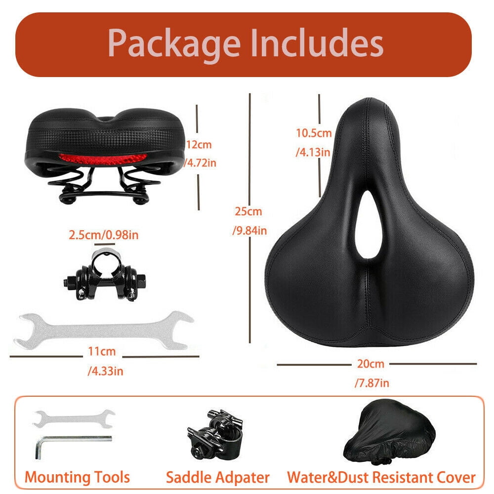 Safe riding with reflective Tail Light – Reflective tail lights, improve cycler’s safety during the night riding. Absolutely No Worry in the dark! Get a good bike saddle for a comfortable ride Want to take a long outdoor riding or just use it daily like going to work or school A comfortable bike saddle is the best bike saddle replacement for your cycling life. Not like many racing bike seats – super narrow and hard, not suitable for long-distance riding, our bike saddle is designed for comfortable riding, keeping you away from the pain for a long time ride. Shock absorption, ventilation, comfort – Thick high-density memory foam padding with an anti-shock rubber ball under the bicycle seat protects you from the sharpness among the road cracks, bumps, and frost heaves. The special breathable center hollow will relieve pressure points in your sensitive areas and avoid the sweaty discomfort. Just enjoy the comfort and never feel tired during your cycling journey. Waterproof, wear & tear resistant – Good sealing performance. Based on the newest vacuum technology, our all-round sealing bike seats can prevent rainwater from seeping in immediately. The surface of this bicycle saddle is made by premium artificial leather, which won’t degrade easily under sunlight like other PVC materials and totally waterproof for daily raining. Six-layer stitch ensures greater abrasion resistance and the lightweight of 800g decreases the burden of long-distance riding. Universal fit & installation tool included – With the standard diameter (7/8") rail clamp and small tool included in the package, our seat can be mounted on the most common bike seat post easily in tens of seconds. It is designed for both men and women for indoor, outdoor use. Note: To avoid any misfits, please make sure to properly measure the bike pole gauge. Waterproof Saddle Cover as Gift We provide a special gift for you. Is the waterproof saddle cover. Dustproof, waterproof, anti UV rays, slow down the aging process. Provide better protection for your saddle.