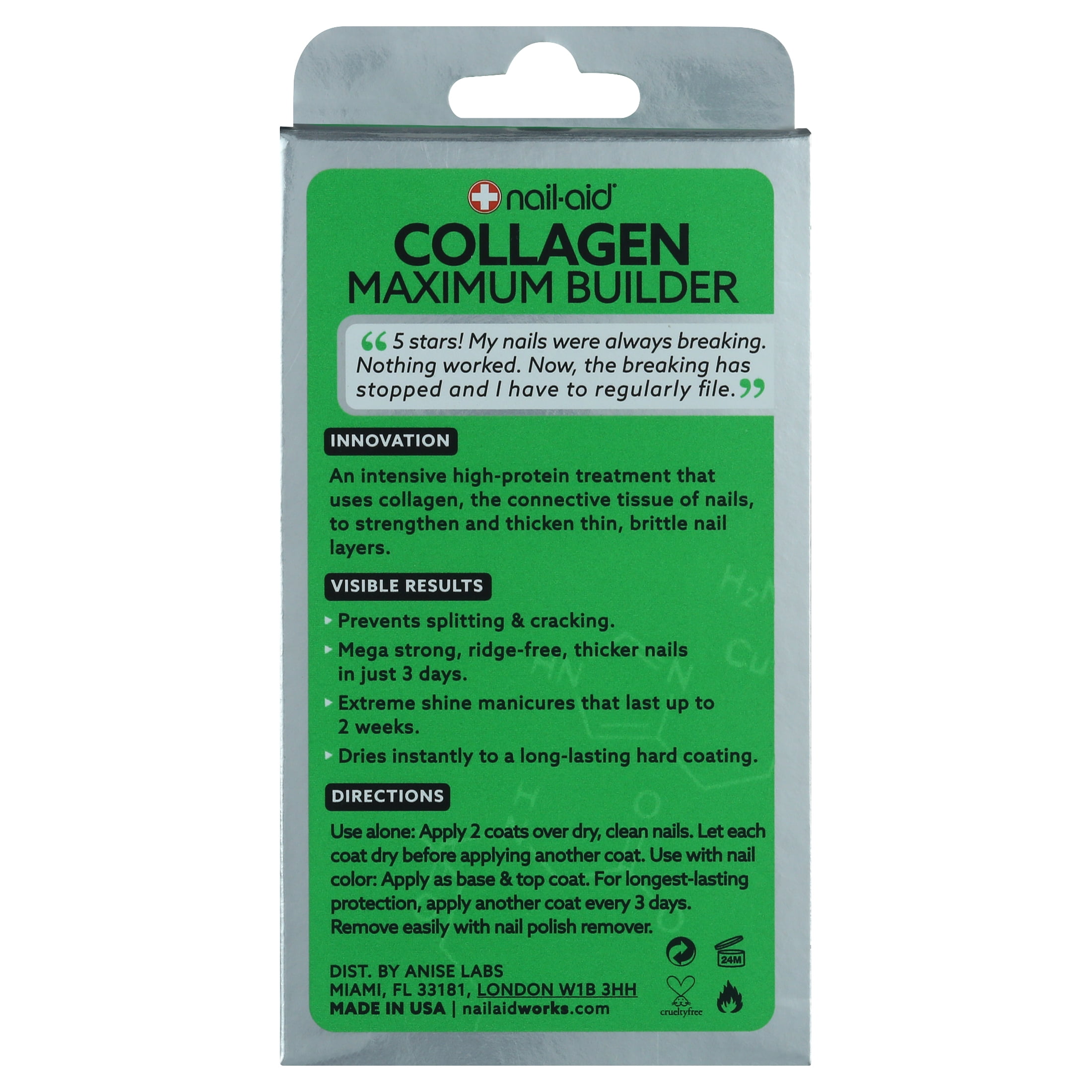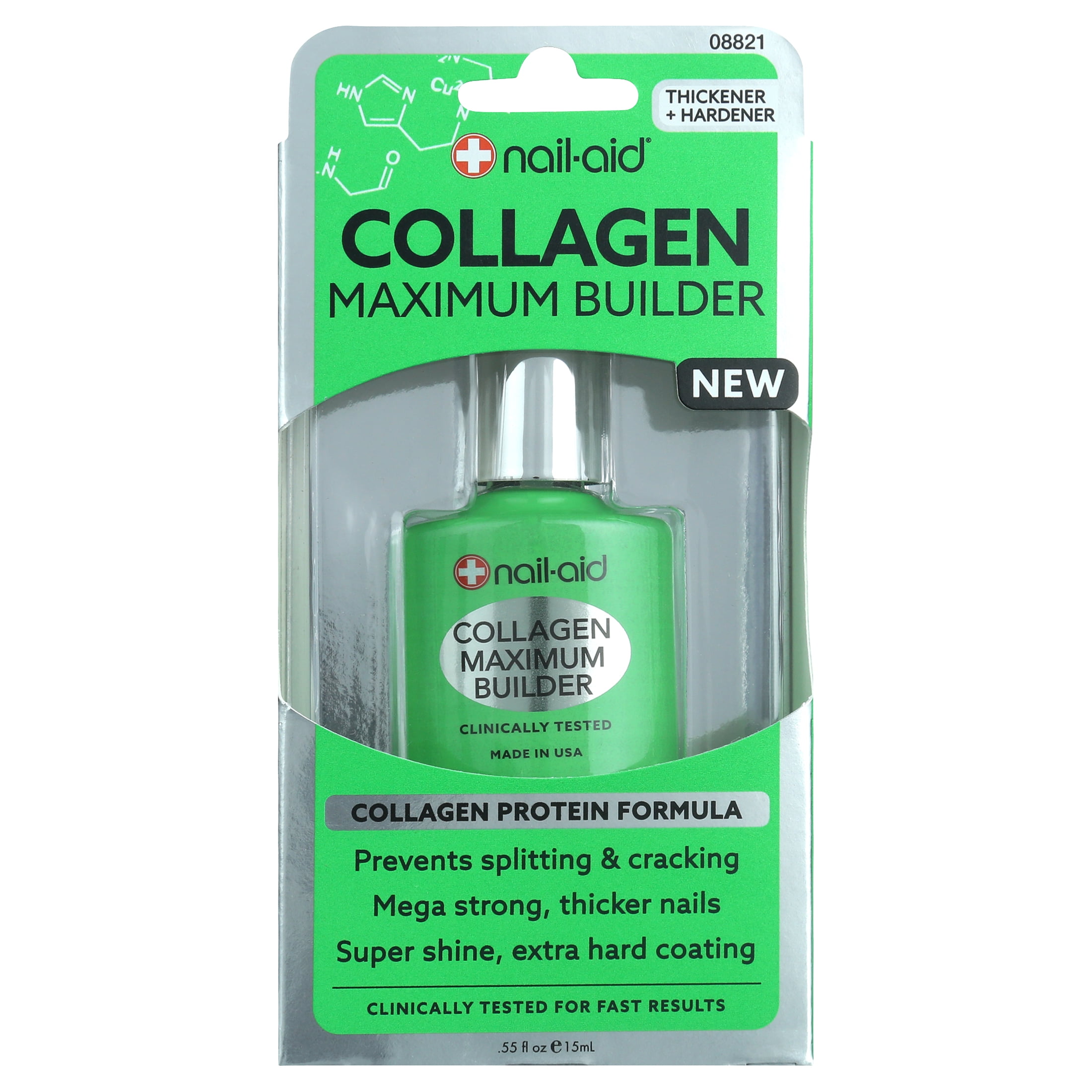 Collagen Maximum Builder"5 stars! May nails were always breaking. Nothing worked. Now, the breaking has stopped and I have to regularly life."InnovationAn intensive high-protein treatment that uses collagen, the connective tissue of nails, to strengthen and thicken thin, brittle nail layers.Visible Results??? Prevents splitting & cracking.??? Mega strong, ridge-free, thicker nails in just 3 days.??? Extreme shine manicures that last up to 2 weeks.??? Dries instantly to a long-lasting hard coating.Nail-Aid Collagen Maximum Builder, .55 fl oz