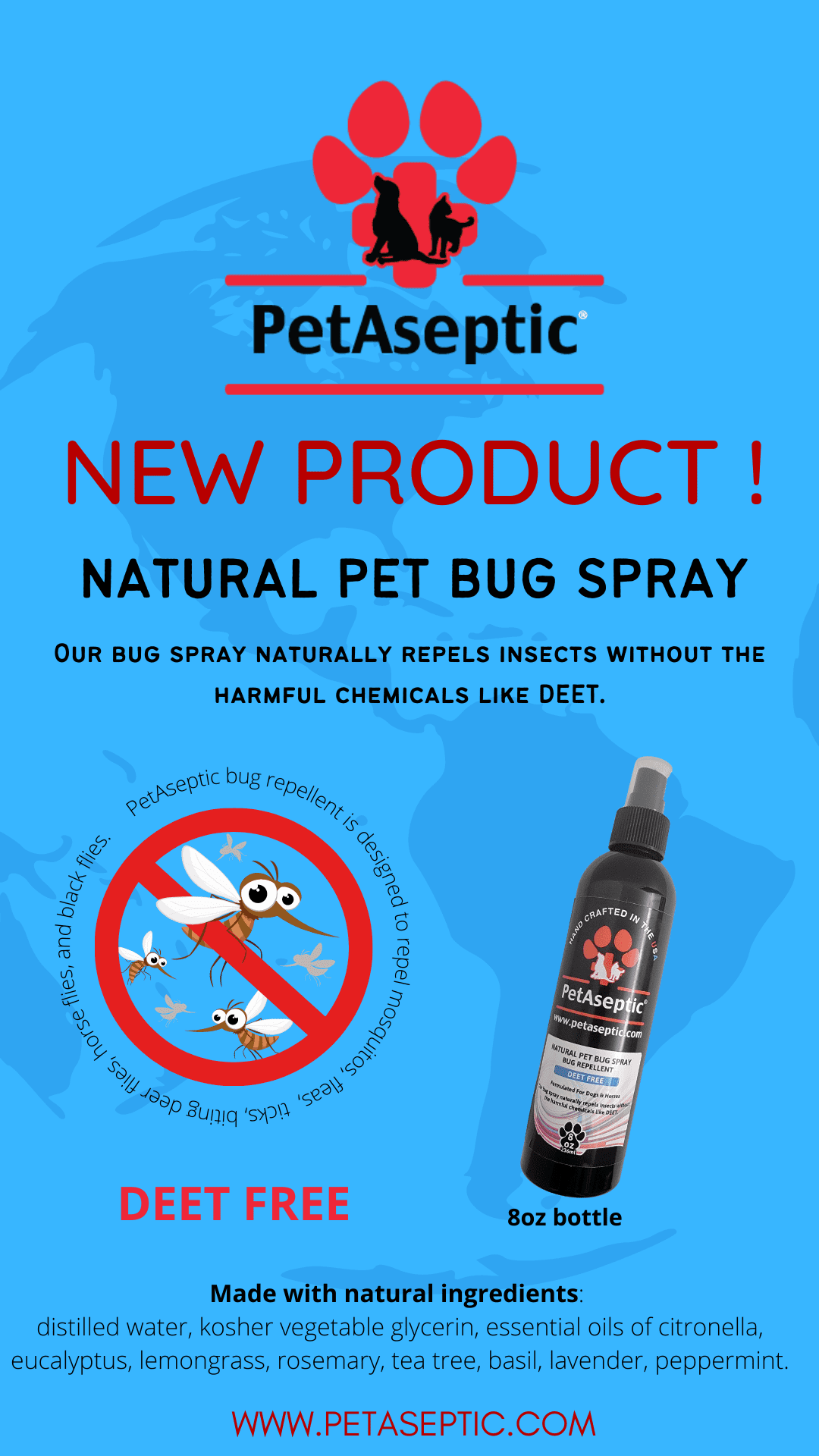 WHAT IT IS: PetAseptic Pet Bug Spray is formulated for dogs and horses. Its deet free insect repellent designed to repel mosquitos, fleas, ticks, biting flies, horse flies, and black flies. PetAseptic Bug Repellent is paraben free, gluten free, and cruelty free. NOT FOR USE ON CATS. Our bug spray naturally repels insects without the harmful chemicals like DEET.