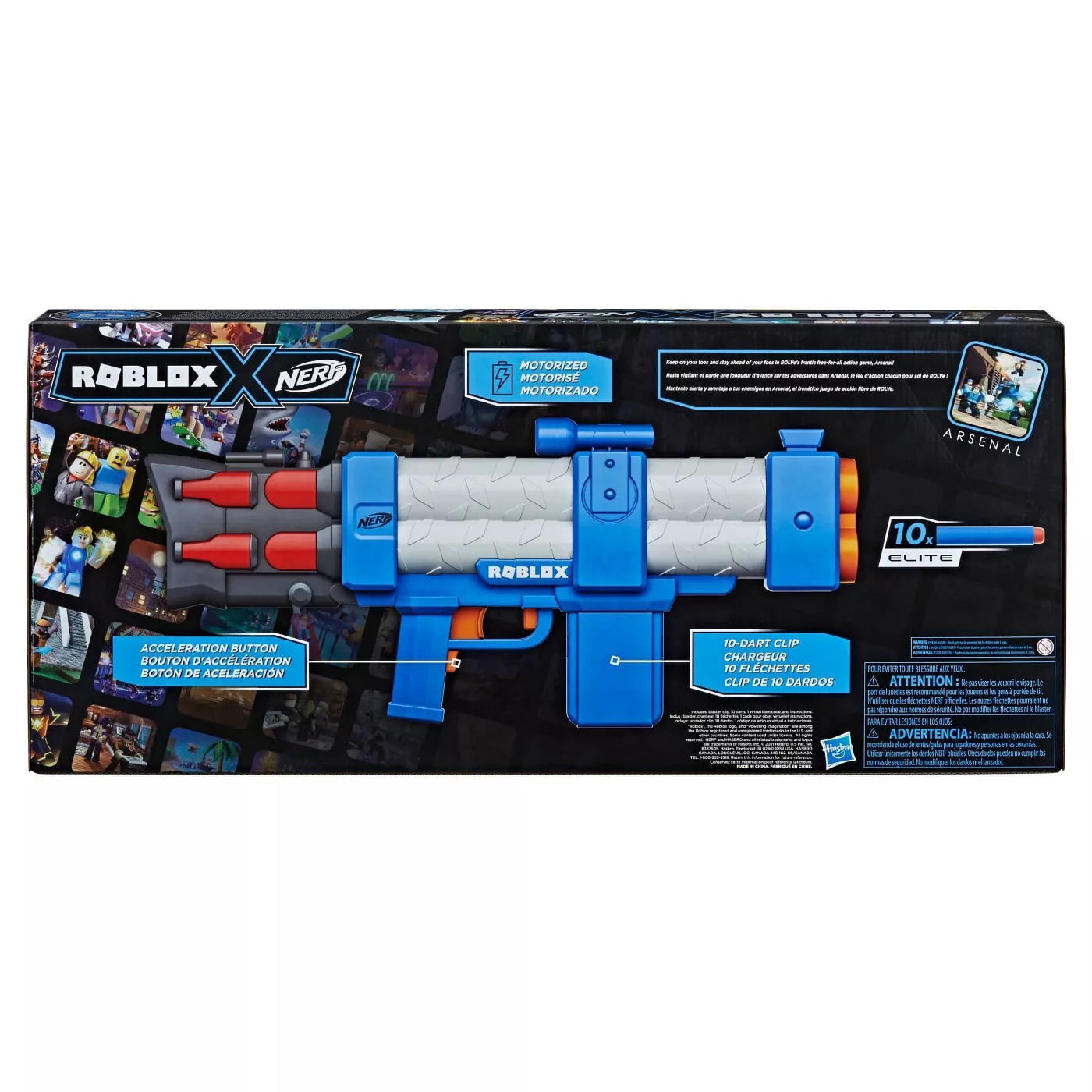 This Nerf Roblox Arsenal: Pulse Laser dart-firing blaster takes its inspiration from the Roblox game Arsenal! The blaster includes a special code that allows you to redeem an exclusive virtual item on Roblox!* It features motorized blasting and comes with a removable 10-dart clip and 10 Official Nerf Elite darts. Fire 10 darts in a row before it’s time to reload! To start blasting, load the clip into the blaster, then hold down the acceleration to power up the motor, and press the trigger to launch a dart into the air. Official Nerf Elite foam darts are tested and approved for performance and quality and are great for indoor and outdoor play. Eyewear recommended (not included). Requires 4x 1.5v AA batteries (not included).