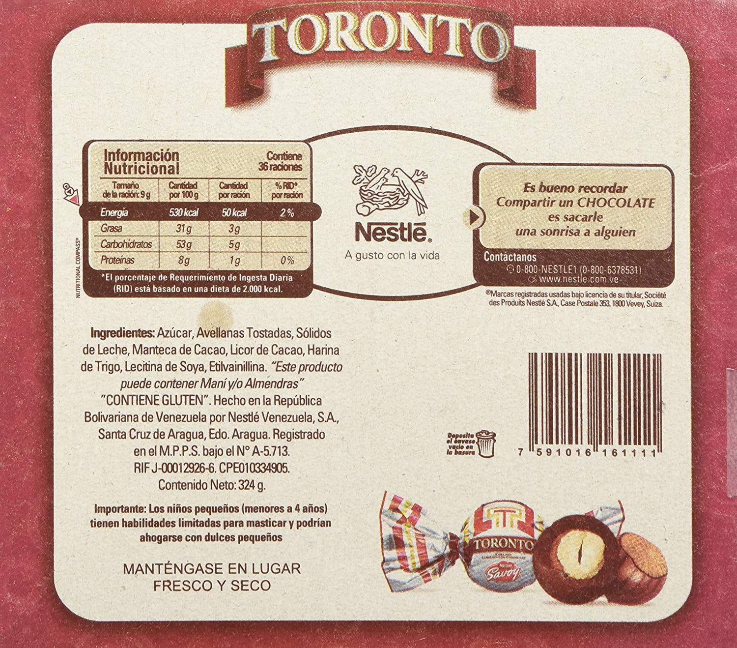 Toronto Chocolate Covered Hazelnut with the Best Chocolate Ever.Classic Venezuelan chocolateAprox. 36 unit 9g eachNestle Savoy Toronto Chocolate Covered Hazelnut Savoy 36 Unit NET Wt 324g