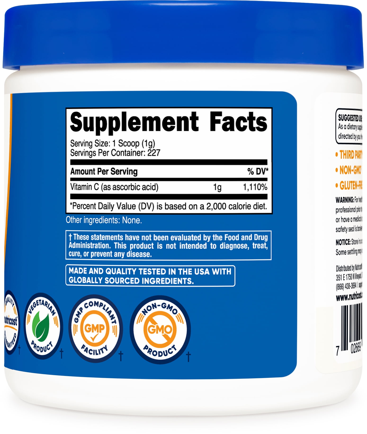 Nutricost Ascorbic Acid Powder (Vitamin C) contains 0.5lbs (8oz) of pure ascorbic acid powder per bottle. This product is non-GMO, gluten free, soy free, and made in a GMP compliant, FDA registered facility. Every batch of each Nutricost product undergoes testing by independent (3rd party) ISO-accredited laboratories to insure a quality product. Nutricost, located and headquartered in the USA, only uses the best ingredients to ensure maximum quality and to help you feel your best! By keeping our recipes simple and clean, you get the best experience possible with Nutricost. All Nutricost supplements are manufactured in a GMP-compliant and FDA-registered facility, provide high-quality ingredients, and offer a variety of options for your health support. And each batch of every product is tested by independent, ISO-accredited laboratories to ensure safety and quality.
