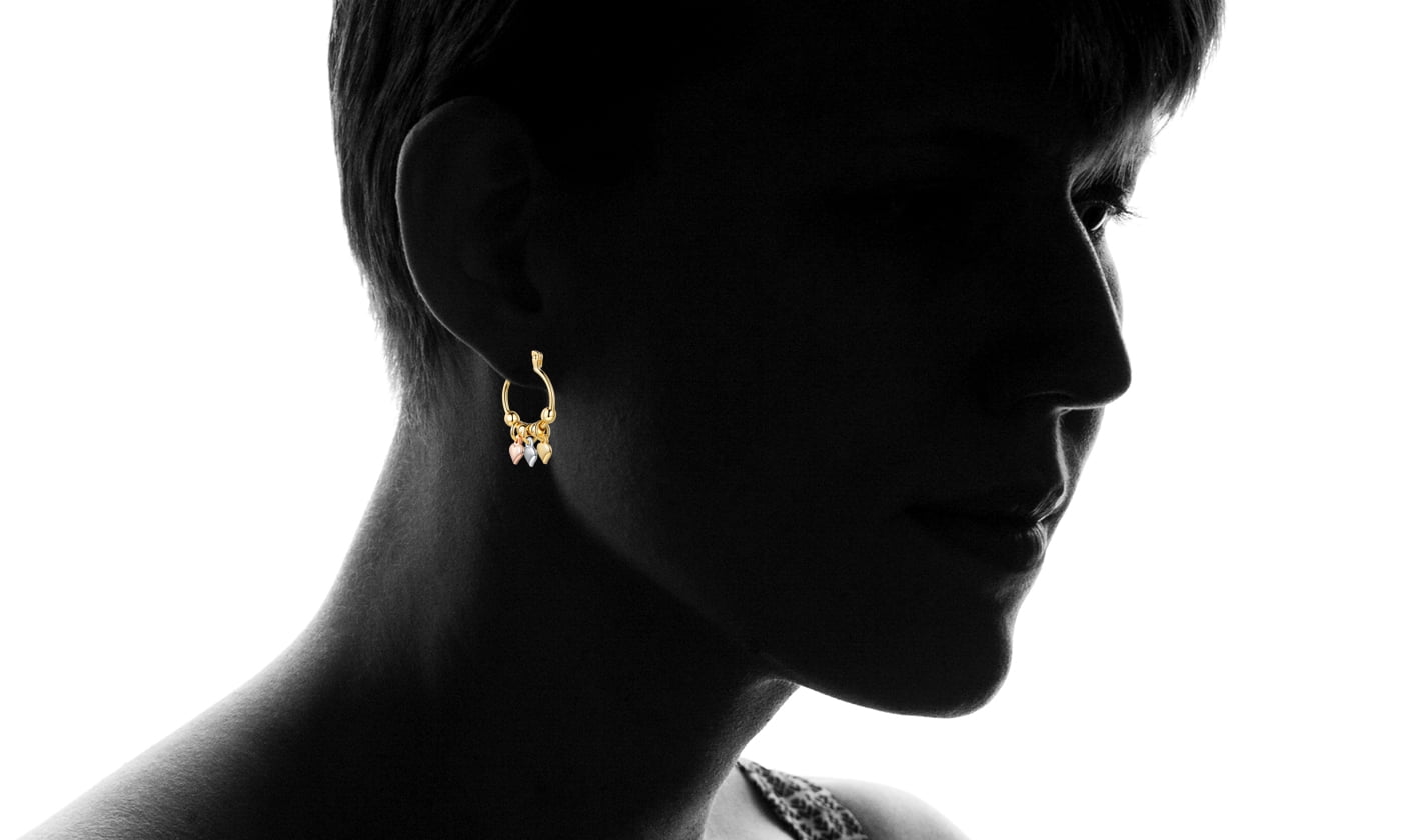 These sleek hoop earrings bring a hint of shine to your ensemble with delightfully tri-gold heart charms and are finished with shimmery 18k gold plating. With hinge back closures for added security, these earrings will turn heads at any occasion. Guaranteed to retain their original content and color.