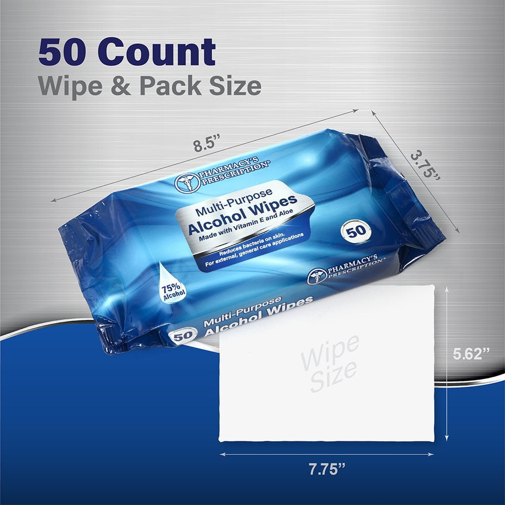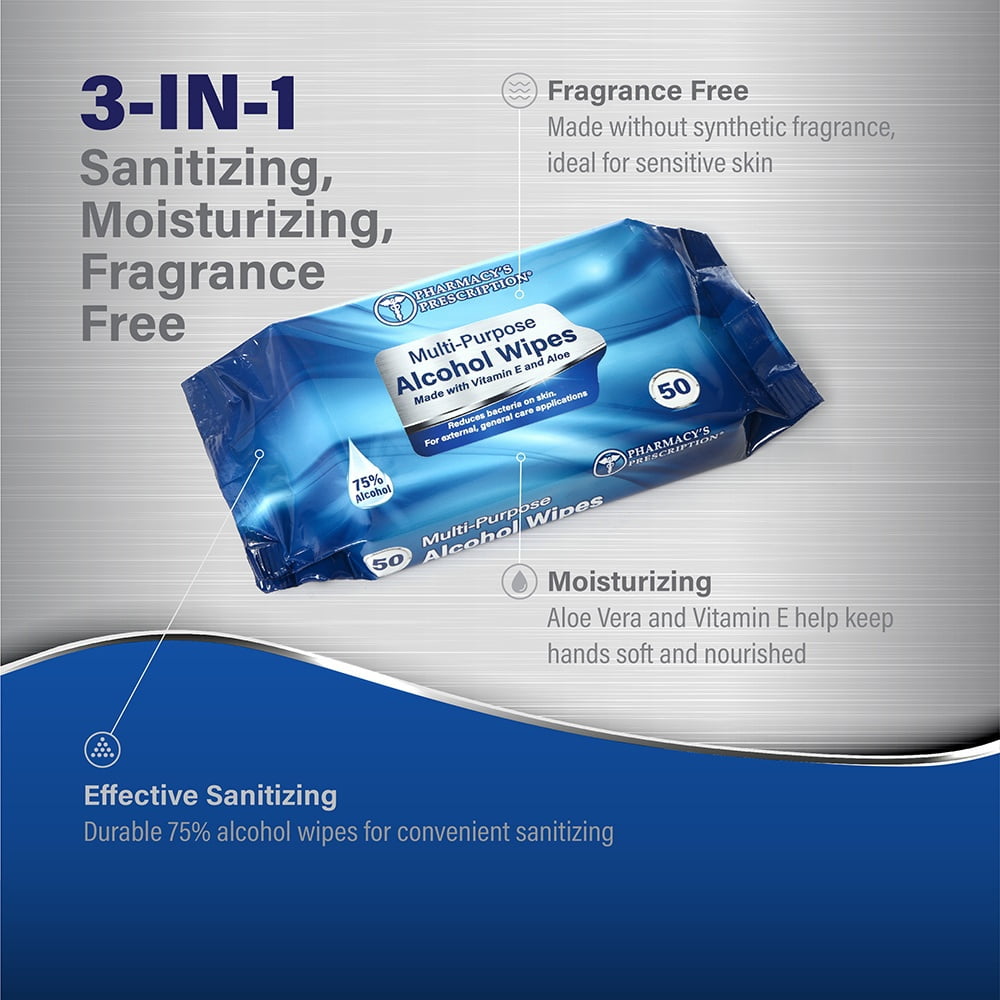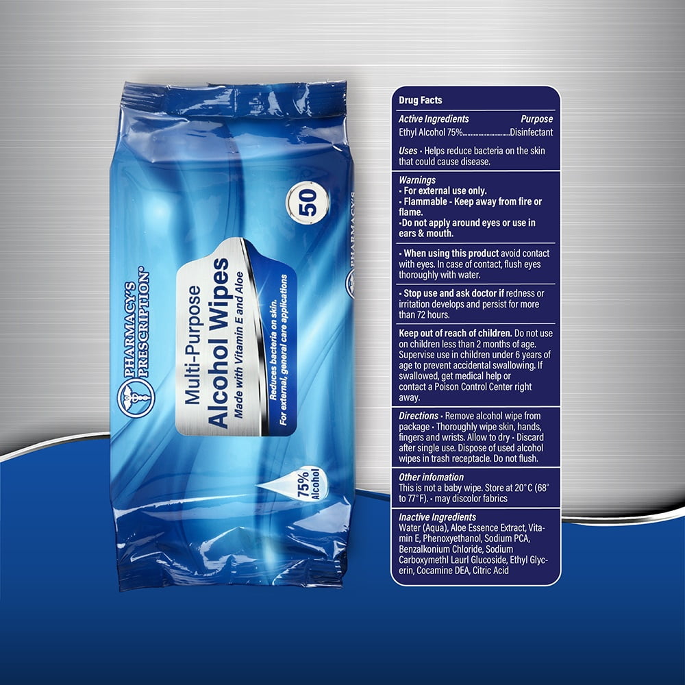 Whether you’re stuck at home, in the office or on-the-go, you’ll be able to keep your hands and surfaces clean with Pharmacy’s Prescription Multi-Purpose Sanitizing Hand Wipes. Our durable, thick wipes get the job done when soap and water aren’t available. We help you tackle sticky fingers, door handles, shopping carts or other public surfaces while cleaning and sanitizing with the help of 75% Ethyl Alcohol. Our non-drying formula has added Aloe and Vitamin E to help lock in moisture and leaves your skin clean and sanitized. Our handy packs of 50 sheets are perfect to keep in your purse, backpack, glove compartment or on your office desk. You won’t want to be caught without a pack of Pharmacy’s Prescription Multi-Purpose Alcohol Hand Wipes.