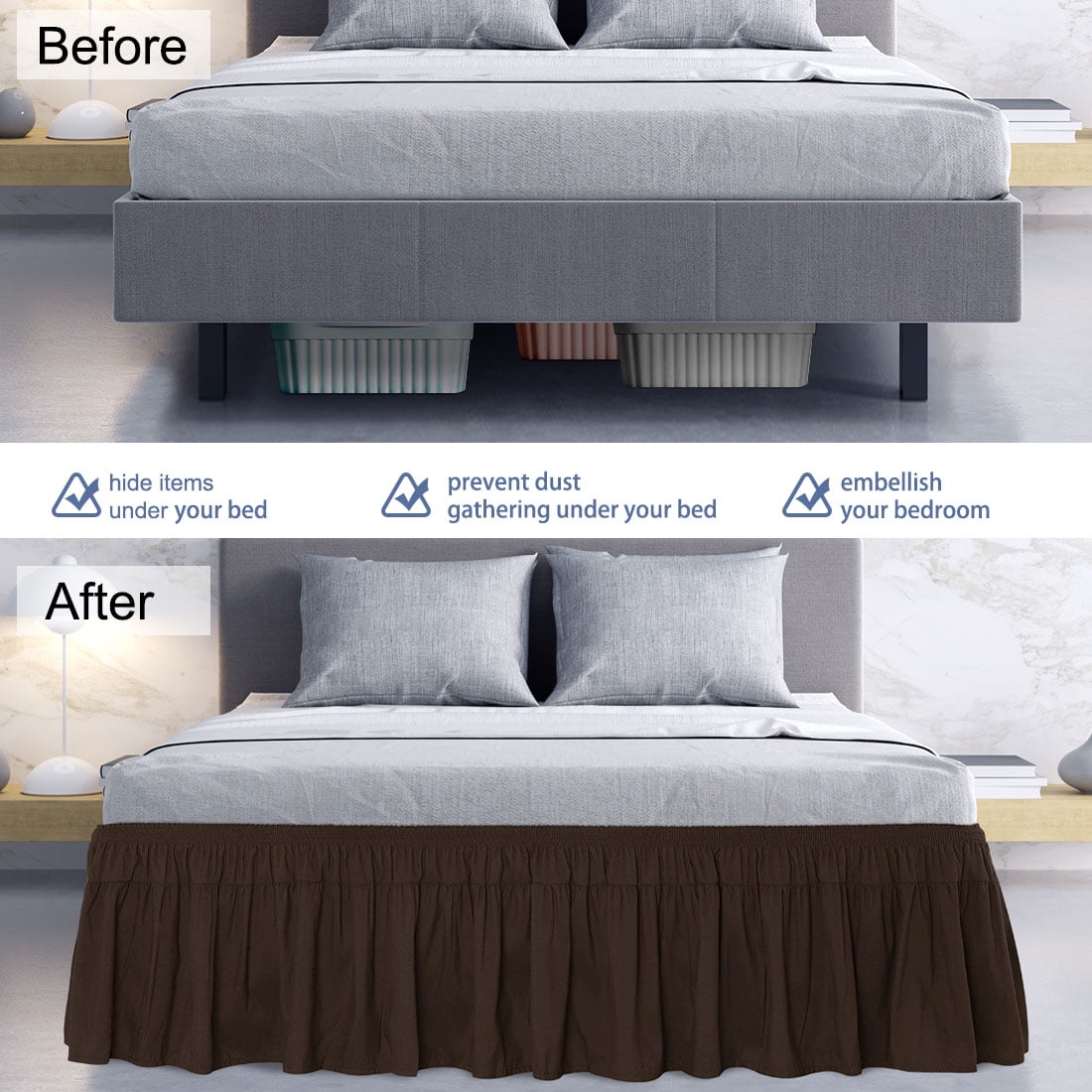 - Generous 16" drop, conceals storage space under the bed. Make bedroom look tidier.