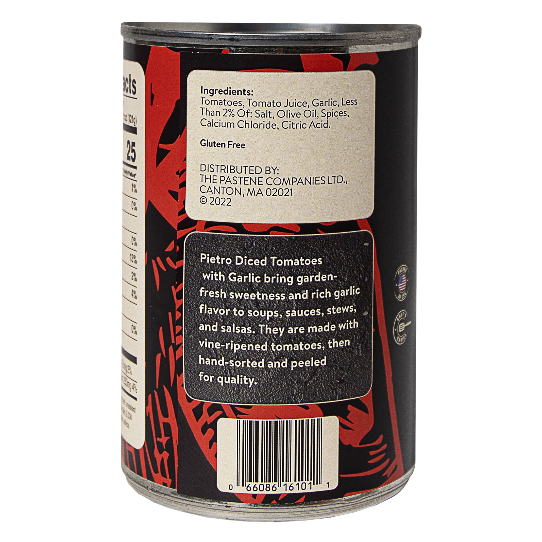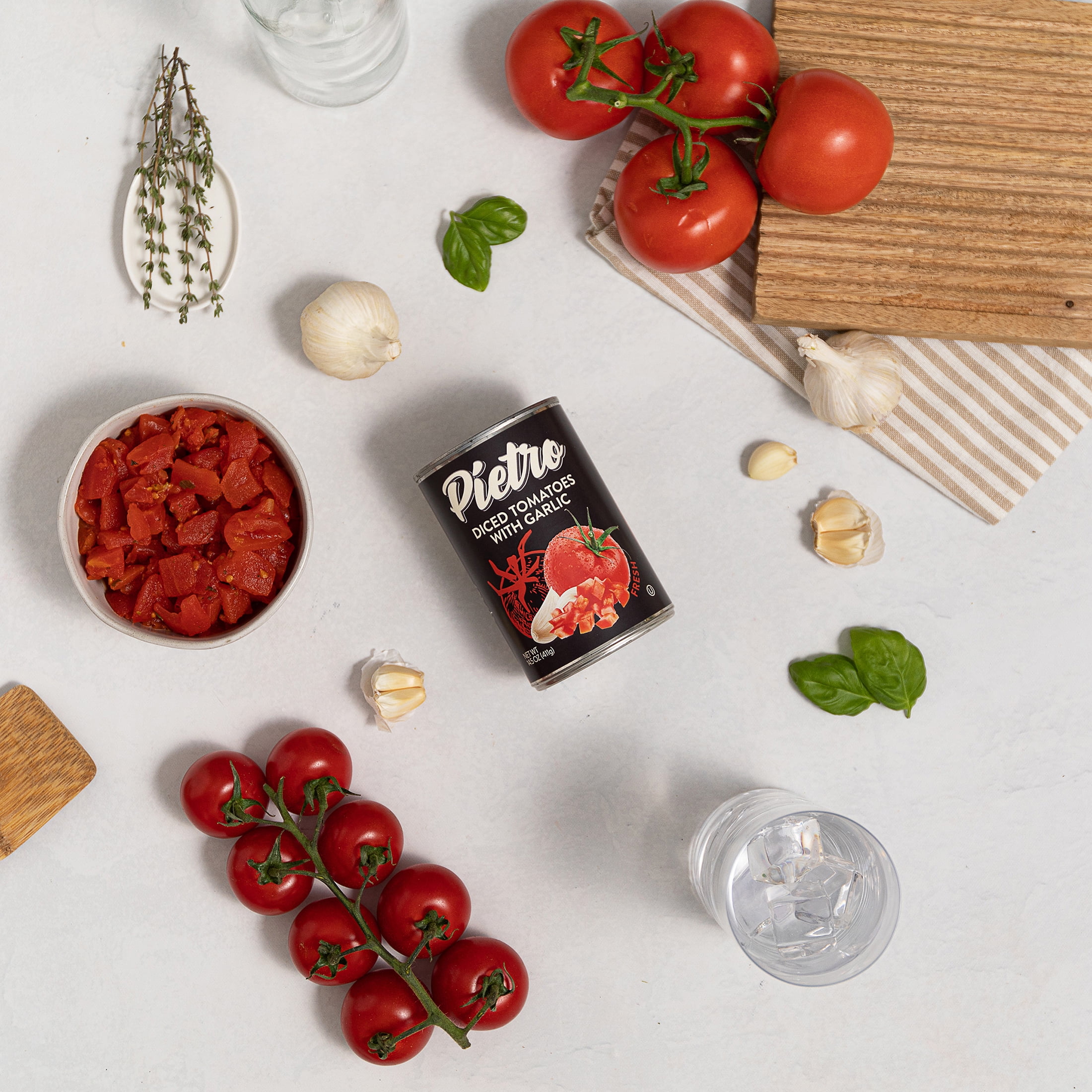 Pietro Diced Tomatoes with Garlic bring garden-fresh sweetness and rich garlic flavor to soups, sauces, stews, and salsas. Our diced tomatoes are made with vine-ripened tomatoes then hand-sorted, peeled, and packed within hours to seal in the flavor. Use Pietro tomatoes to infuse Italian goodness into every meal.