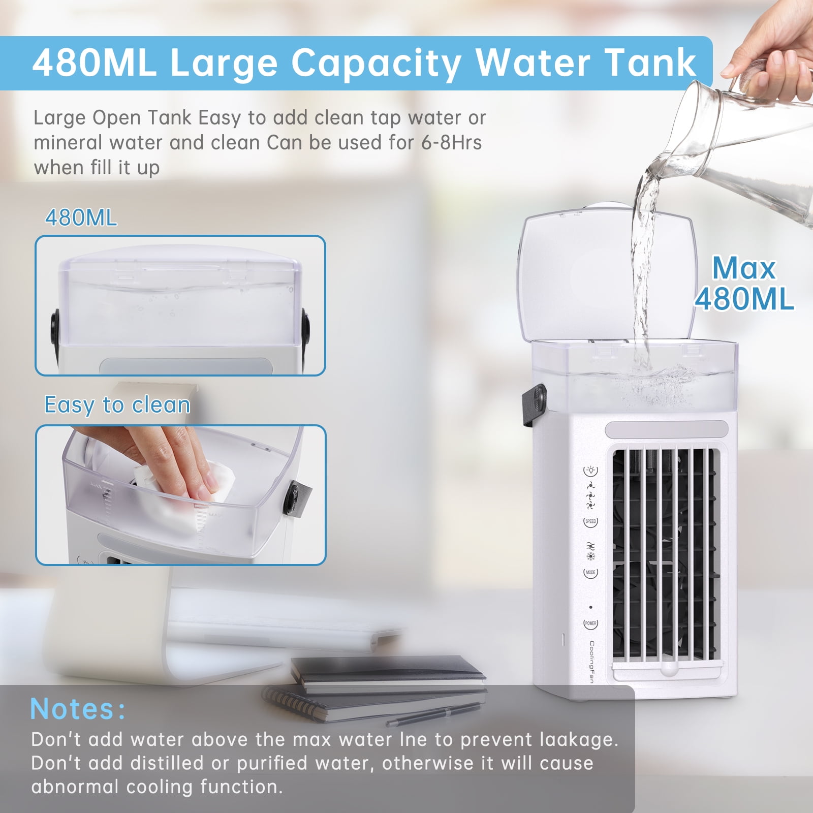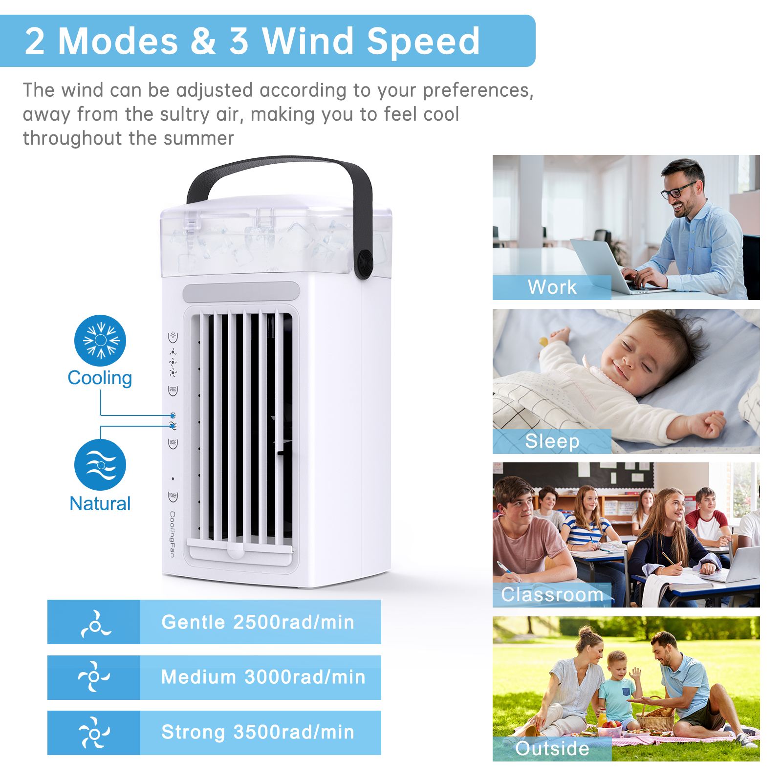 ❄️【2 Kinds Lighting & Low Quiet】Our mini desk air cooler built in 7 color lights and soft night light,allows individual control to turn off the lights when the fan is operating,can bring you a good mood and help you fall asleep better;Work powerfully at a low noise level can bring you quality sleep,won’t bother you.