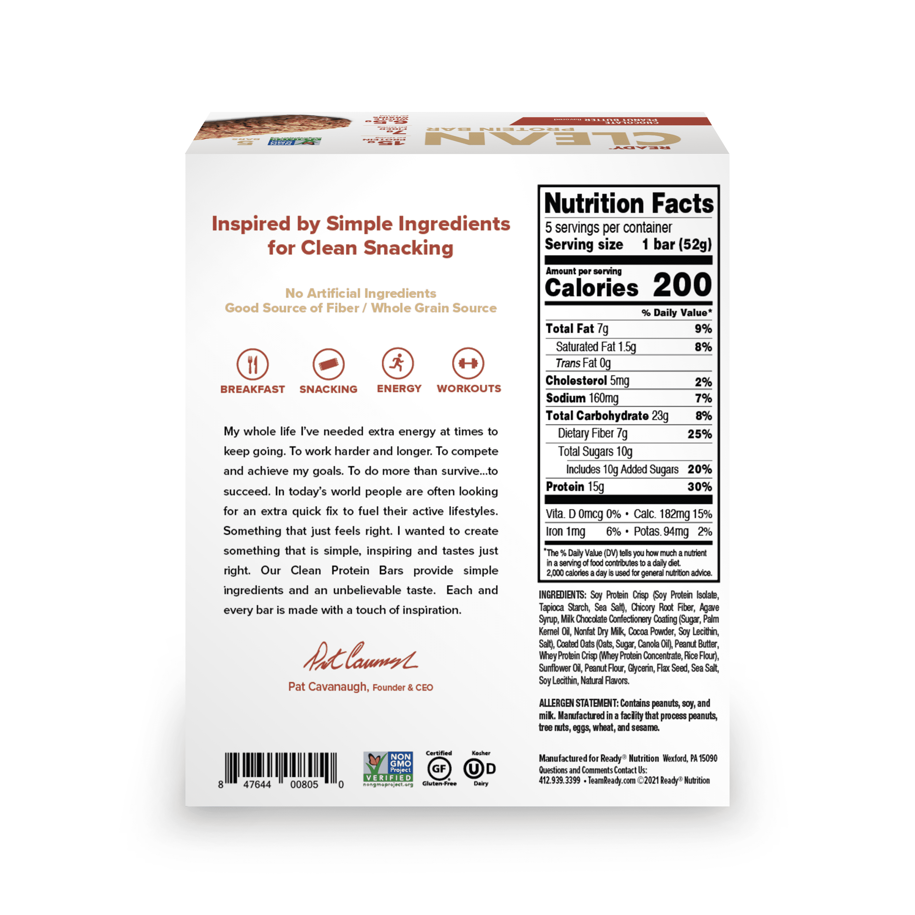 Why Clean Bars are specifically engineered to support your fitness needs, our all-natural CLEAN bars support muscle building and muscle recovery and aid in maintaining your optimal weight or help with your weight loss goals. Our Clean Bar is packed with a powerhouse of ingredients including 15g of whey and plant-based protein, 7g of fiber to satisfy cravings, 6.5g of nutrient-rich whole grains and fiber and fatty acid rich flax seeds. Our protein-based bars are not only packed with clean ingredients that work just as hard as you do, but they are a delicious addition to your healthy diet. Designed for athletes who demand clean, all-natural performance products, our CLEAN Bars are gluten free, non-gmo, and contain no artificial ingredients. This product does contain peanuts, milk, and soy. Our mission is to inspire athletes to achieve their goals through Effort, Attitude, and Energy. We are driven to provide athletes with the highest-performing, all-natural sports nutrition products to support their journey.
