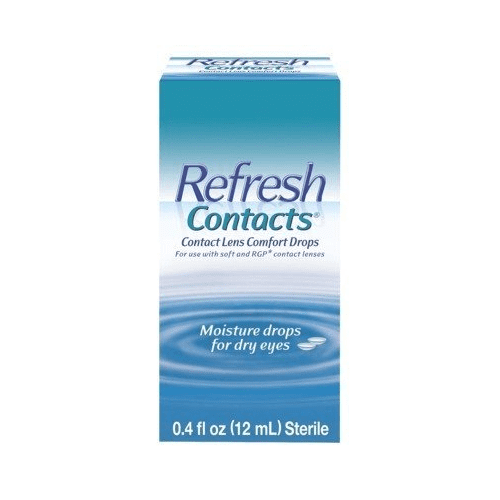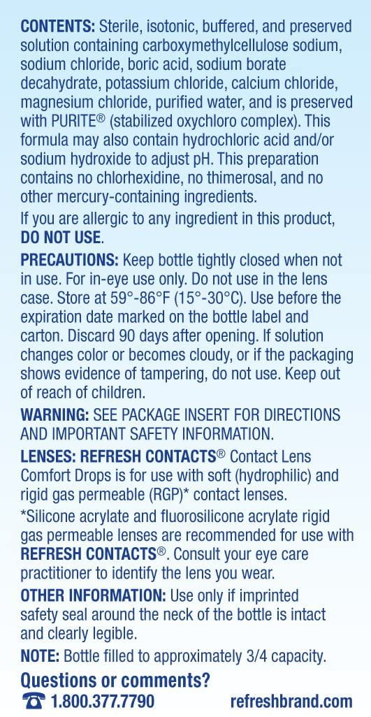 Instantly moisturizes and soothes dry eyes caused by soft and rigid gas permeable contact lens wear. Every drop creates a liquid cushion that comforts and protects for long lasting relief. Comes in a convenient multi-dose bottle and is safe to use as often as needed so your eyes can feel good – anytime, anywhere. For use with soft (hydrophilic) and rigid gas permeable (RGP) contact lenses. This preparation contains no chlorhexidine, thimerosal, and no other mercury-containing ingredients. Sterile. Silicone acrylate and Fluorosilicone acrylate rigid gas permeable lenses are recommended for use with Refresh Contacts. Consult your eye care practitioner to identify the lens you wear.