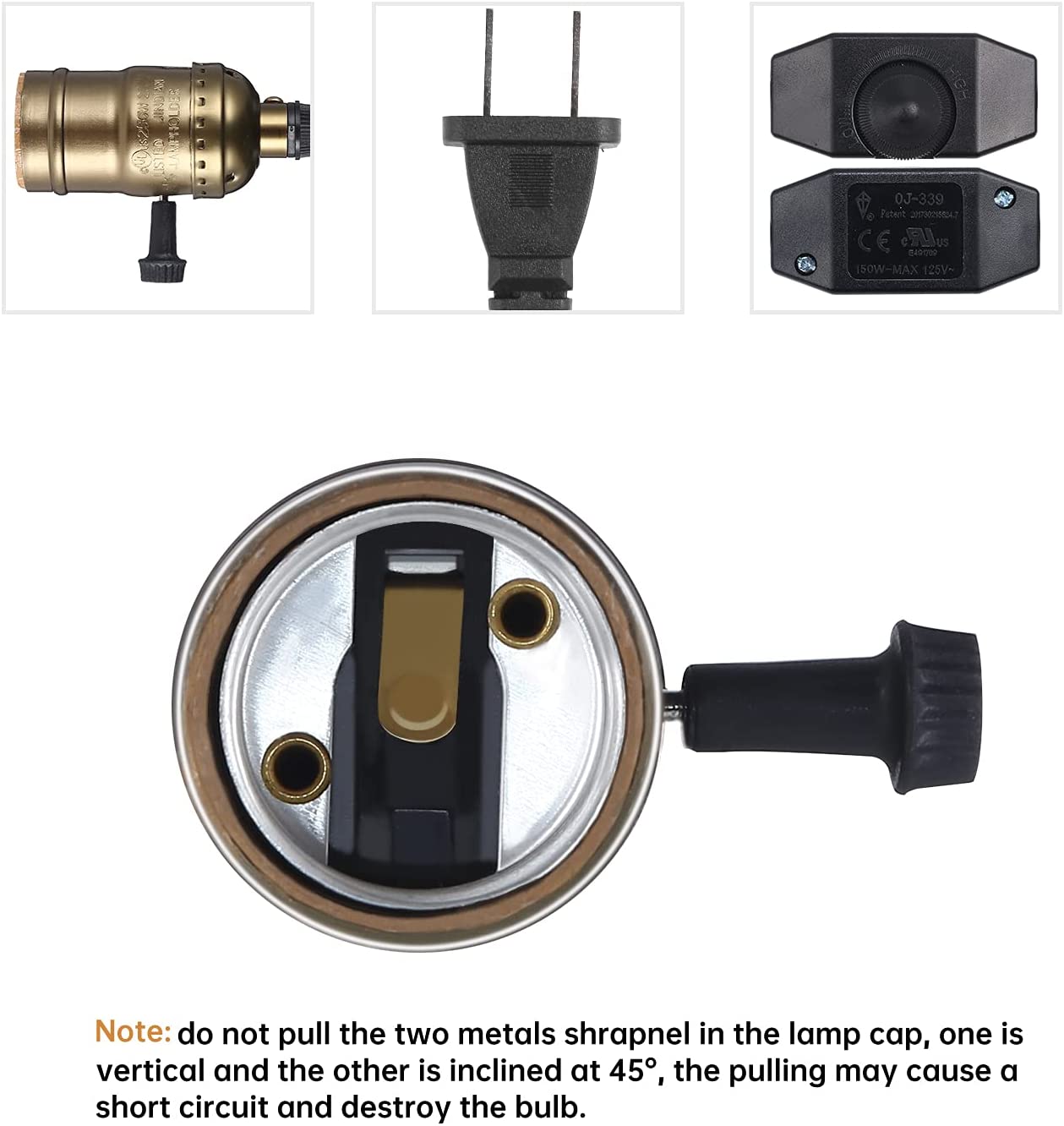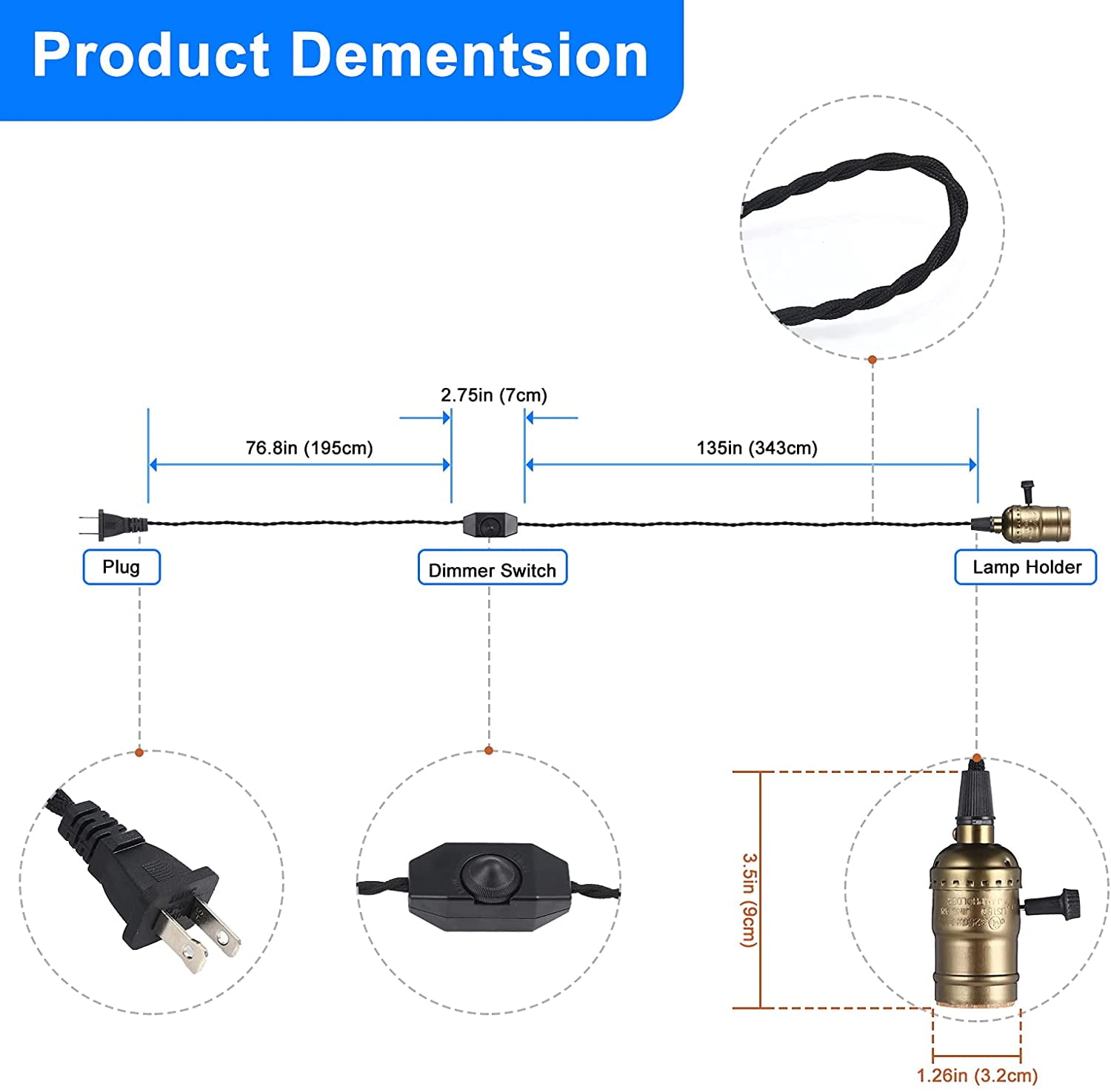 Vintage bulb cord kit: E26 socket (suitable for E26 blubs), dimmer switch (at the 0.95m/6.4 feet from the plug), 2 prongs plug. The switch of the lamp is on the lamp holder, and the gear switch can adjust the brightness according to ambiance and mood.