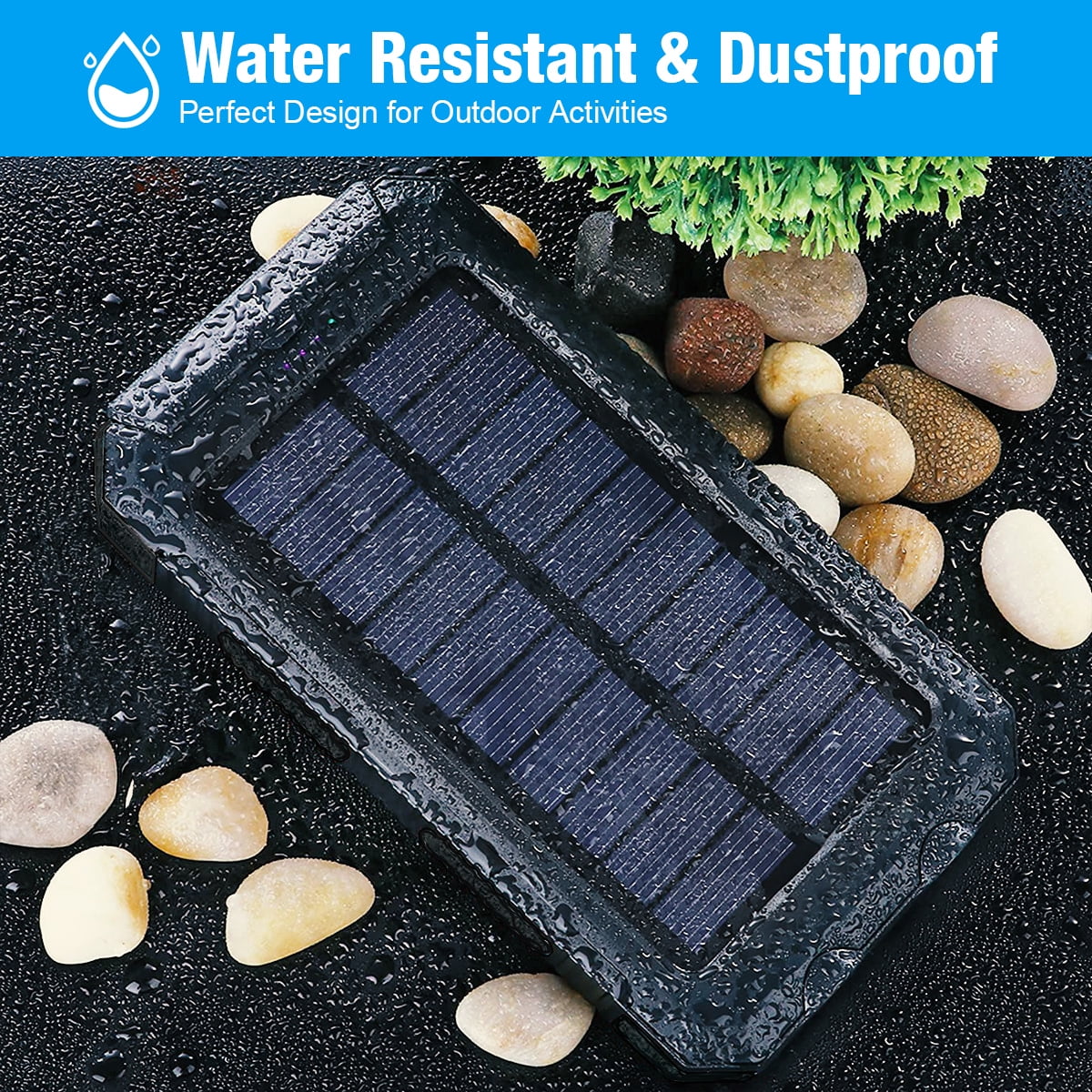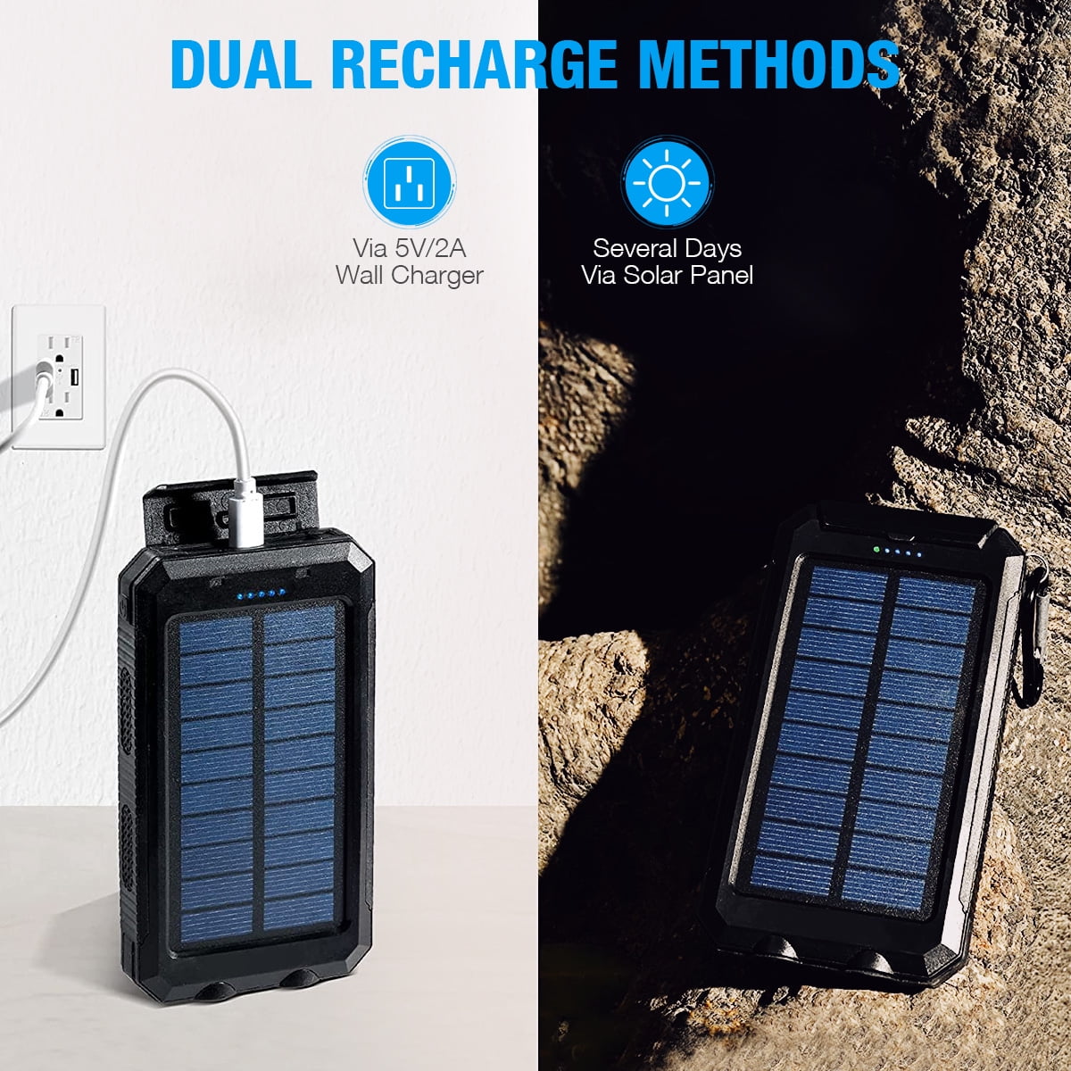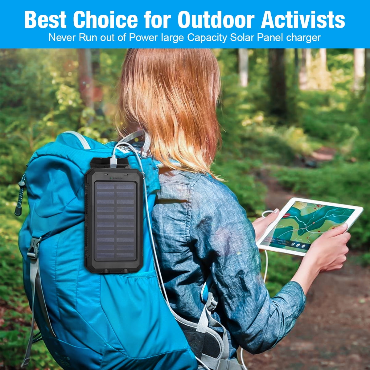 The solar portable charger is 20000mAh capacity allows you to charge for your iPhone X more than four times, perfect for daily and travel use. This solar power bank allows you to charge your USB devices when there is no wall outlets near you, and it will convert the solar power into electricity for convenient use, perfect for outdoor use. It is designed with two output ports, allowing you to charge two devices simultaneously or sharing the power with your friends when necessary. The solar power bank has dual built-in with bright flashlights, and a built-in compass, a handy and practical tool for outdoor activities, like camping, cycling, fishing, traveling, hiking and beaches. Keep your devices charged on-the-go with this compact 20000mAh power bank. It fits easily into any pocket or bag, making it the perfect charger on the couch, or anywhere else your phone needs a boost. Besides, it comes with a buckle for easier hanging on your backpack, perfect for outdoor travelling use.