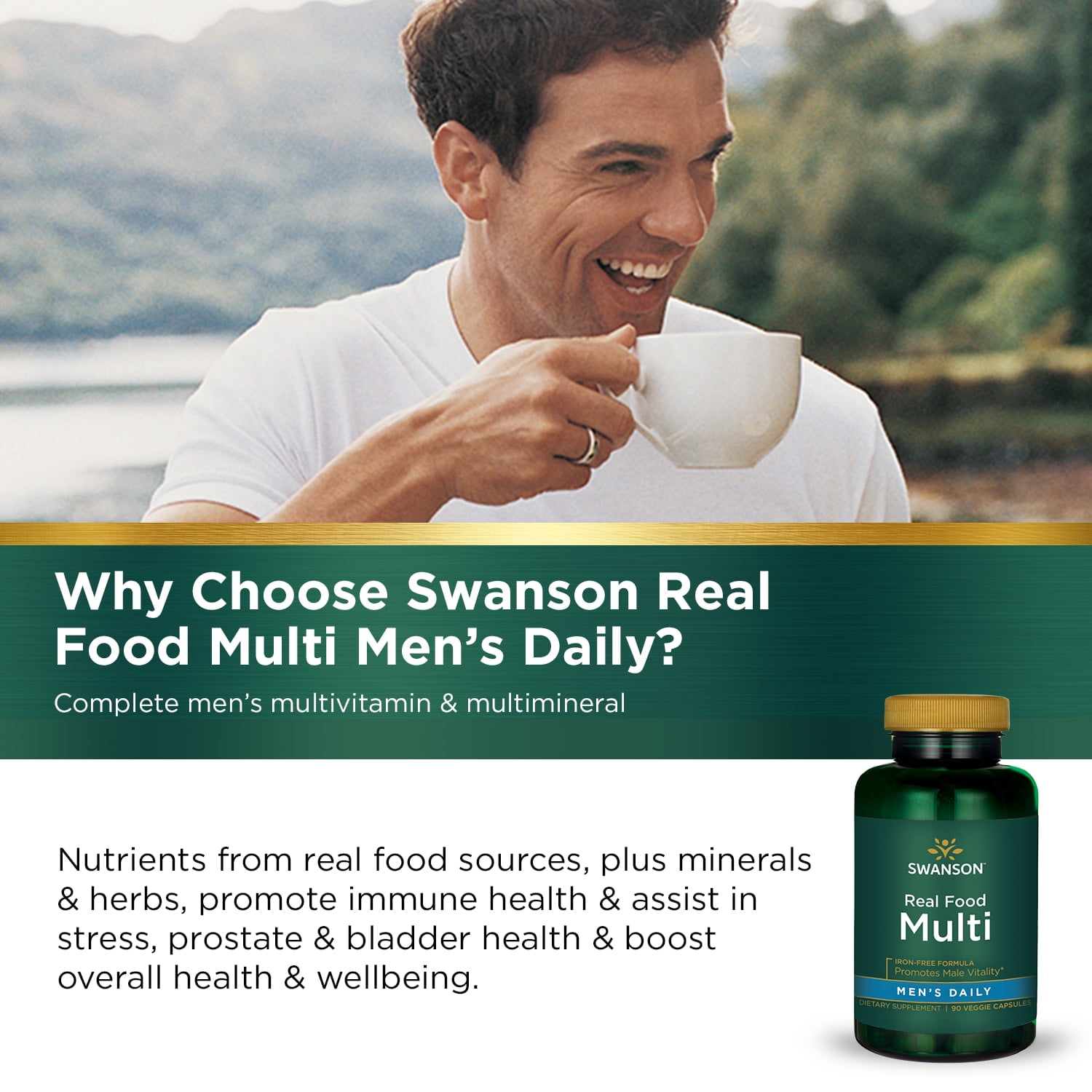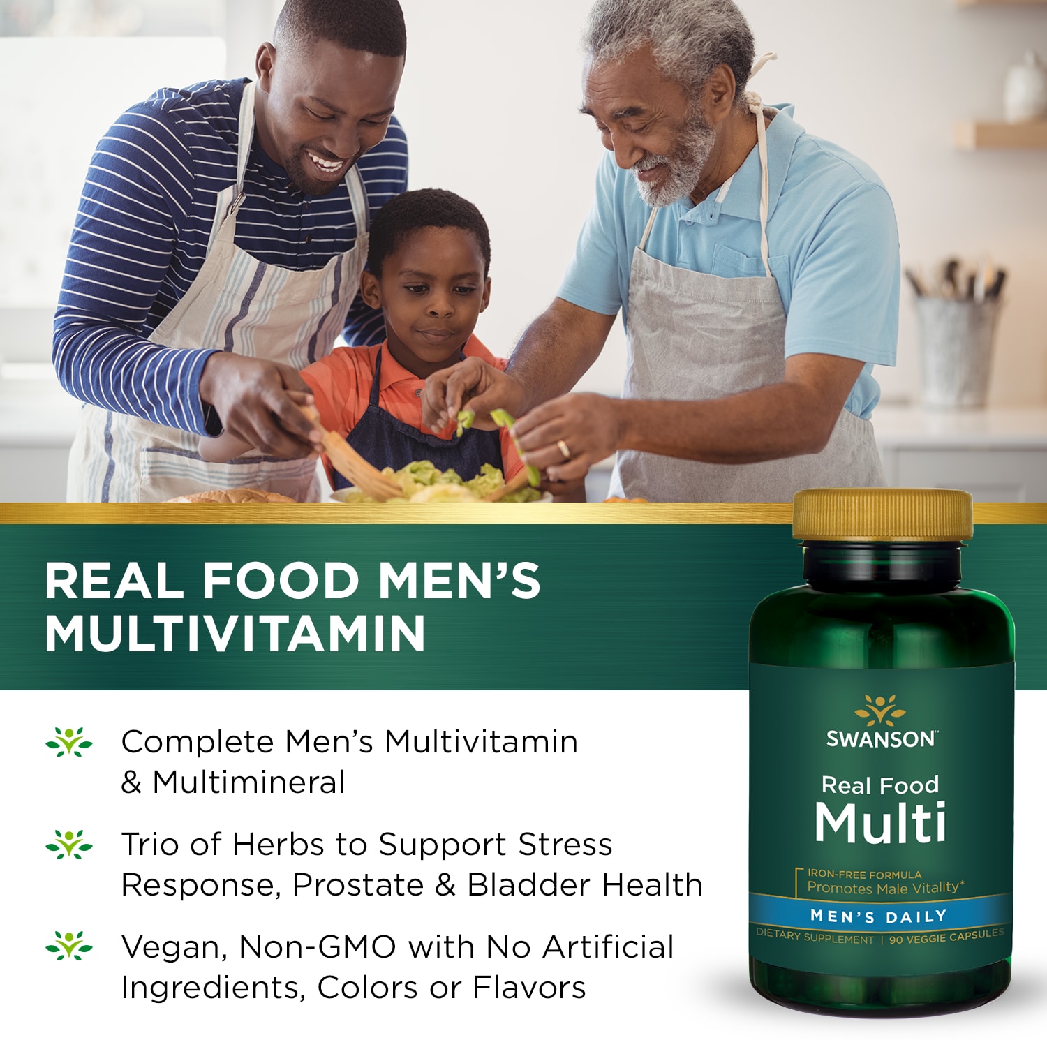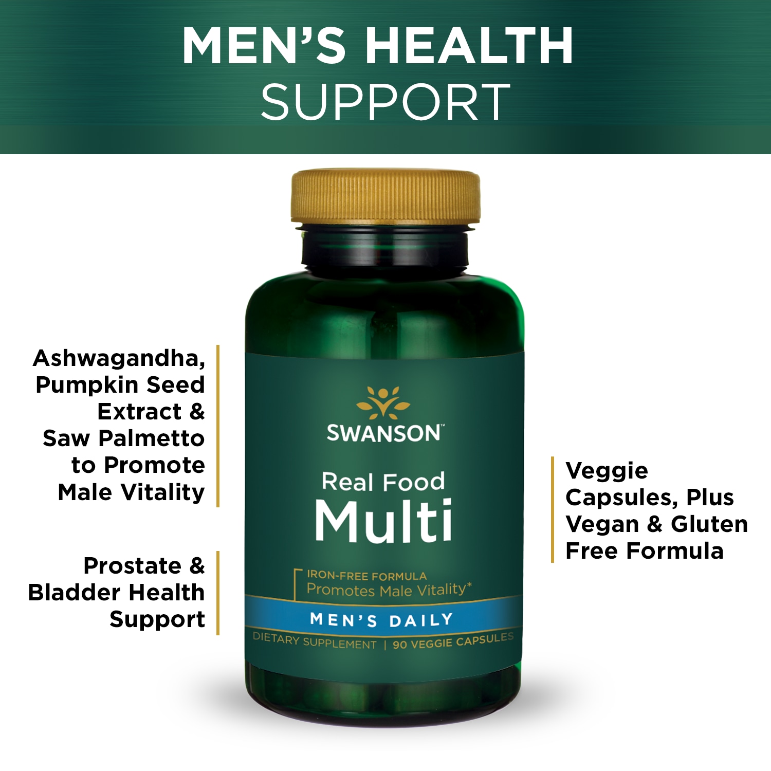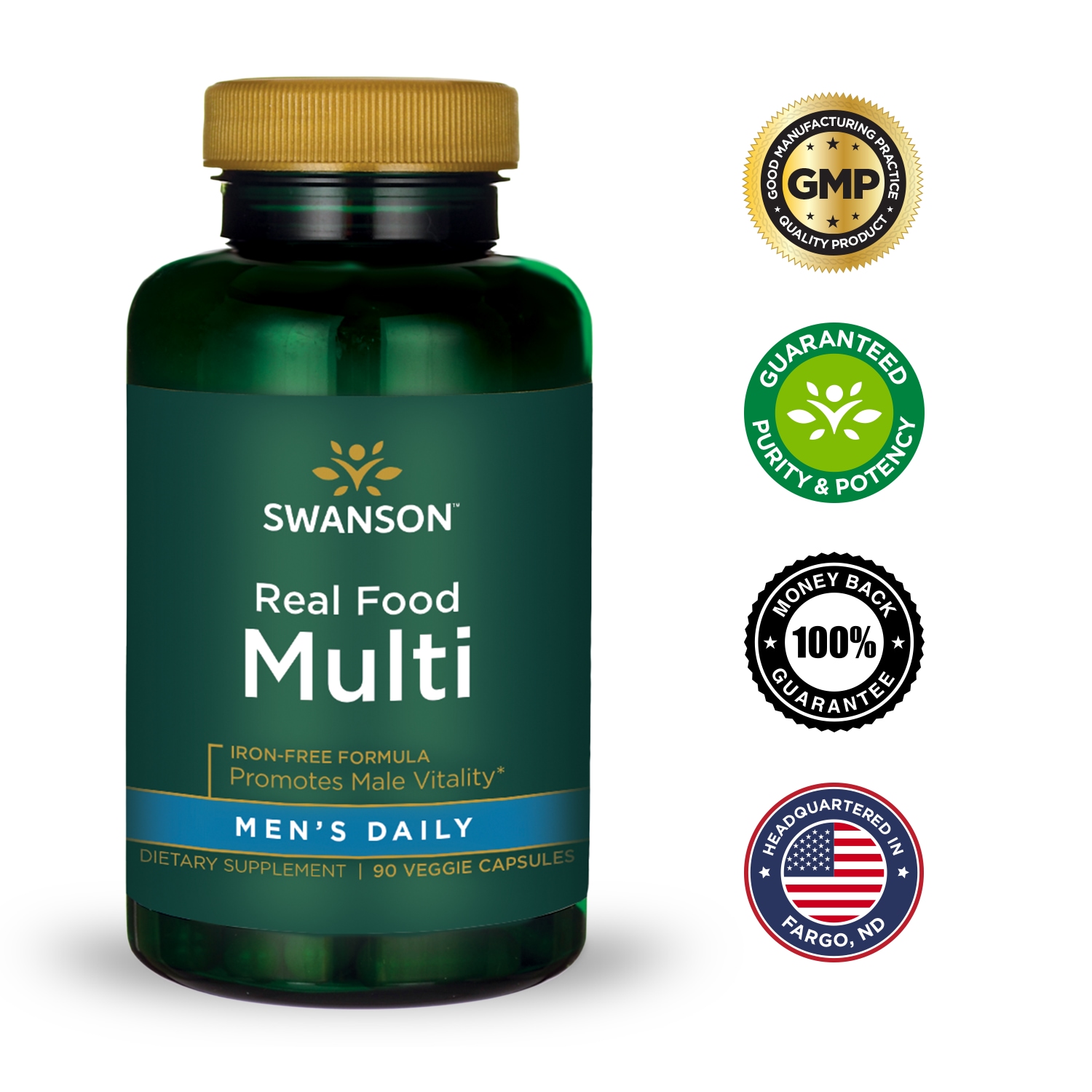 - REAL FOOD SOURCES – Swanson Real Food Multi Men’s Daily is vegan with no yeast, synthetic ingredients or artificial colors, plus comes in a fully transparent label format. That means everything we add to our products appears on the label with no proprietary blends. Your body knows what it wants, and that’s exactly what our Real Food Multi is about. Support your overall health and wellness, promote healthy prostate and bladder function and enjoy balanced stress support from real food nutrition.