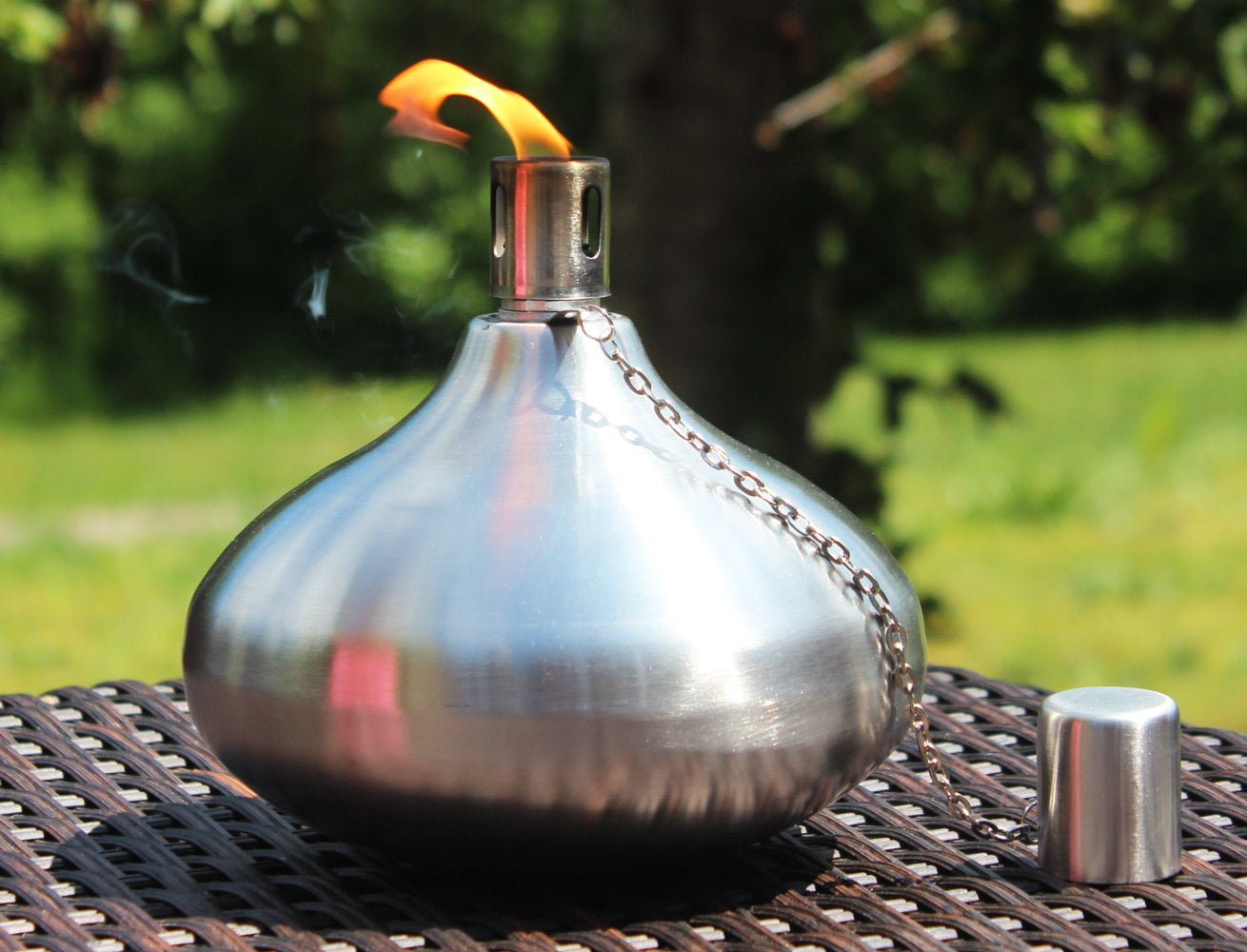 Table Torches for Backyard or Patio, Steel with Fiberglass Wick. Our table top brushed stainless steel torch will keep away the mosquitos while providing a decorative accent to your backyard or patio party. This 5.5" x 5.5" sleek teardrop stainless steel design holds up to 30oz for all night burning. High quality fiberglass wick will last many seasons (wick normally lasts 1 year). No insert needed. Unscrew top (push down and twist) and fill the torch directly with funnel (not included). Clean burning citronella torch oil recommended (not included). Store product away from the weather conditions when not in use. Store upright in a dry location.