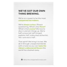 TAZO ORGANIC PEACHY GREEN FLAVORED GREEN TEA IS A REFRESHING BLEND OF GREEN AND BLACK TEAS WITH FLOWERY PEACH AND DELICATE CUCUMBER NOTES. EACH 8 OZ. SERVING CONTAINS 31-45 MG. OF CAFFEINE WITH OUR STANDARD BREWING METHODS. OUR FLORAL TEA INFUSION IS CERTIFIED USDA ORGANIC, NON-GMO PROJECT VERIFIED AND FLAVORED NATURALLY, SO YOU CAN SIP BLISSFULLY. INCLUDES TWENTY FILTERBAGS OF TAZO ORGANIC PEACHY GREEN FLAVORED GREEN TEA.Tazo Organic Peachy Green Flavored Green Tea, 20 Count