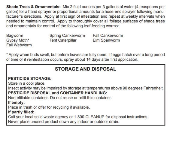 Thuricide BT Caterpillar Control – 8 oz.Thuricide BT Caterpillar Control Low toxicity to humans and animals Used by Organic growers Made from a bacteria that is toxic to certain pests Same active ingredient as Dipel CONTAINS: Bacillus Thuringiensis in liquid form USE ON: Vegetables, citrus, nuts, shrubs, trees, tobacco, and flowering plants. CONTROLS: Controls lepidoptera larve: caterpillars and worms. i.e. cabbage looper, orange dog, tobacco hornworm, imported cabbageworm and rindworm. RATE: 2 – 4 tsp. per gallon. APPLICATION:: Mix with water, add spreader-sticker, use as a thorough cover spray. Product Label