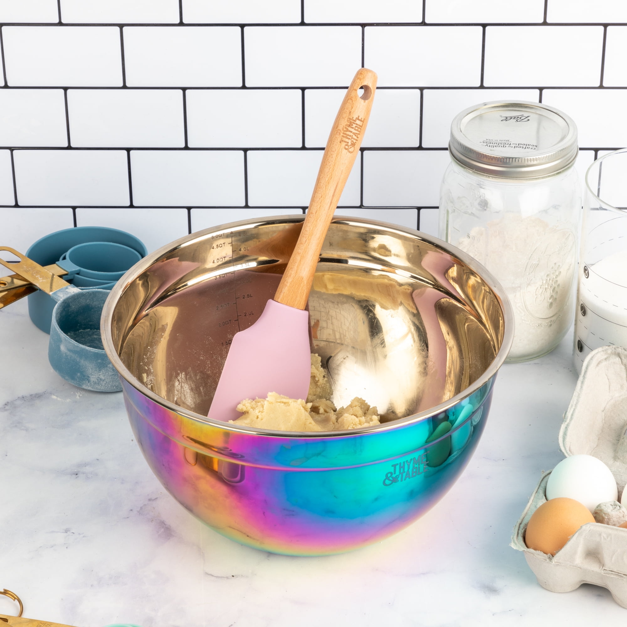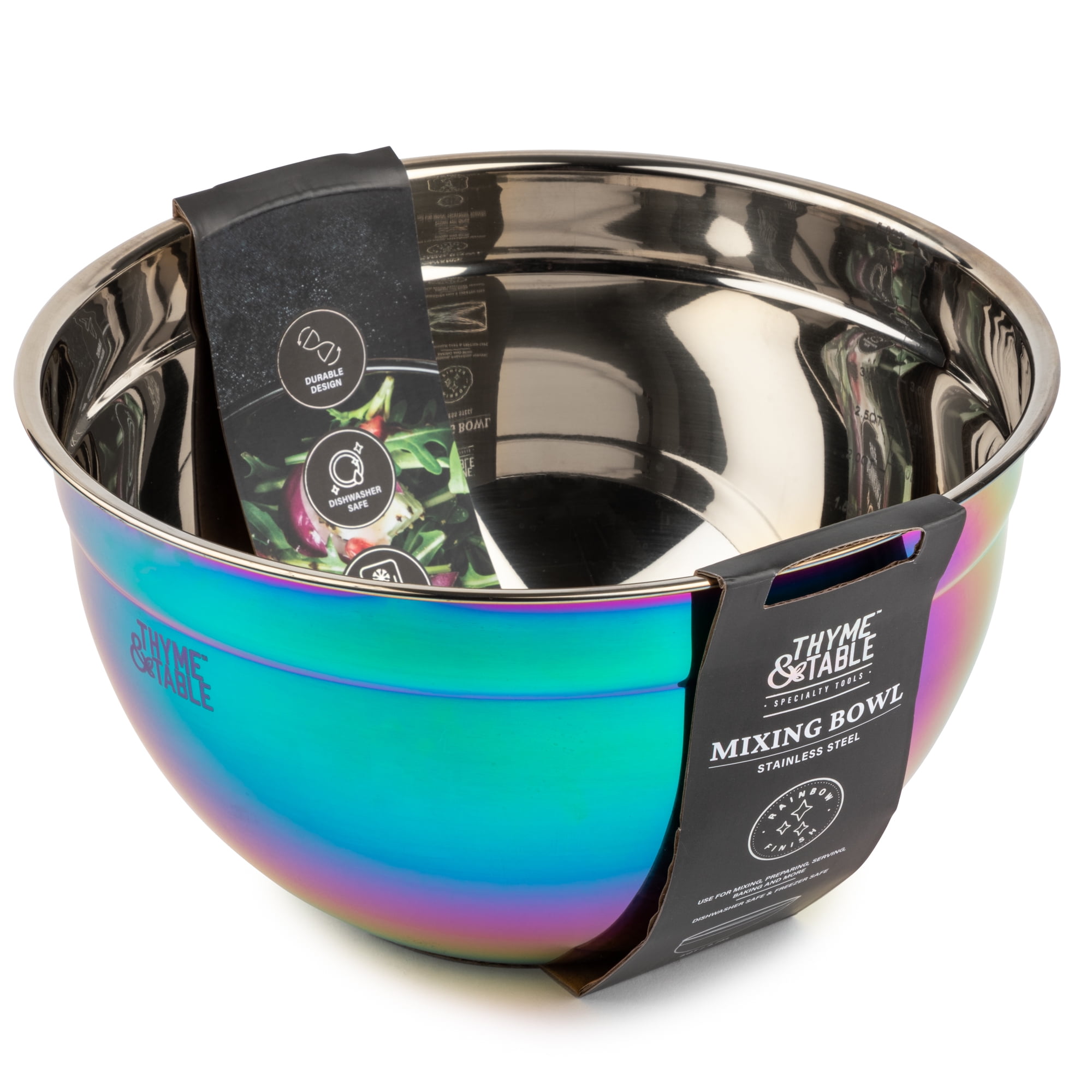Thyme & Table Stainless Steel Mixing Bowl is a part of the Thyme & Table Specialty Tools Collection. The stainless steel mixing bowl is perfect for mixing, preparing, serving, baking and more. Holds 5 quarts with a rainbow finish.