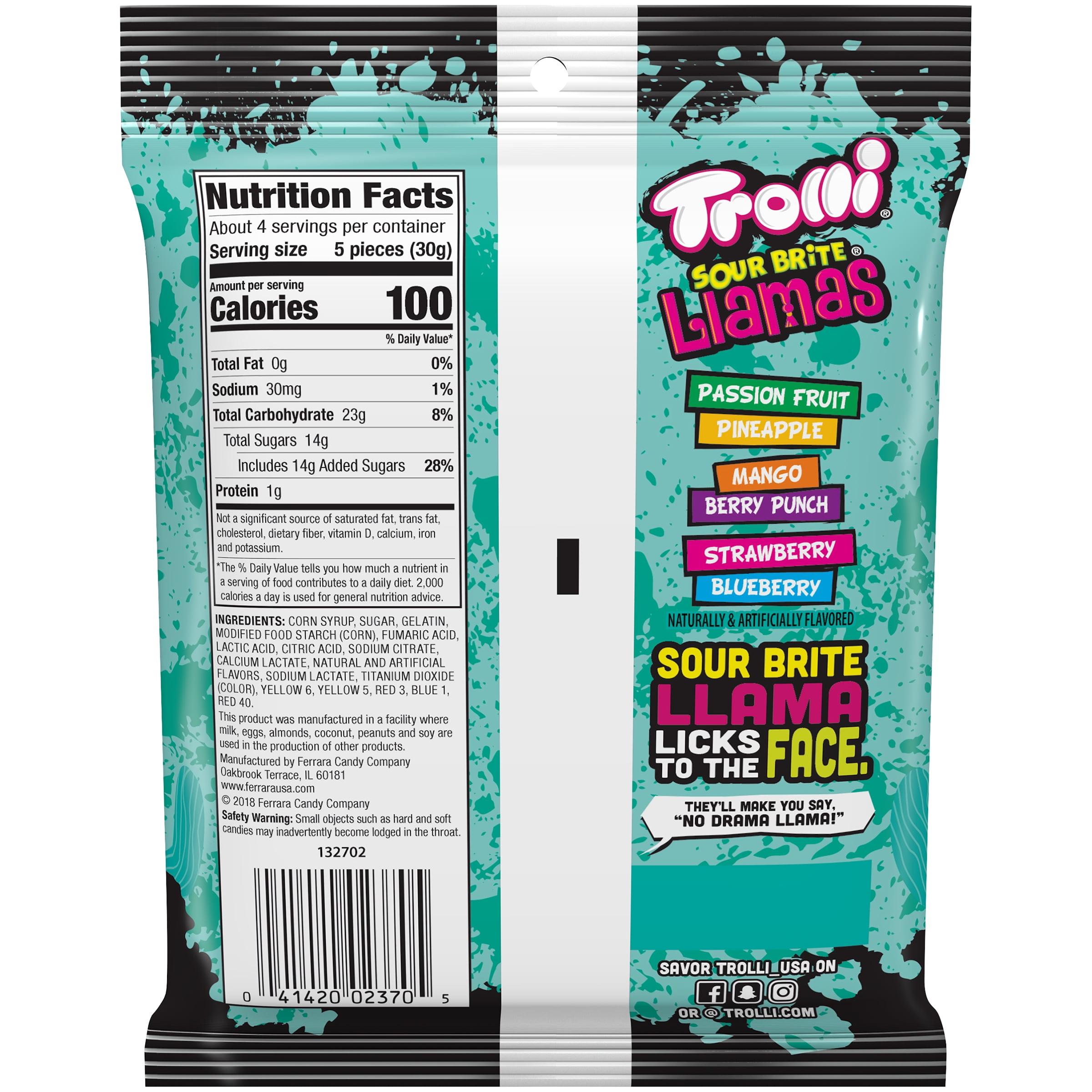 Trolli Sour Brite Llamas are the cutest sour gummies! This funny candy means no llama drama, just Trolli goodness in sweet, fruity gummies. These gummi animals are two-toned and with two different flavors in one bite: Passion Fruit and Pineapple, Mango and Berry Punch, and Strawberry and Blueberry.