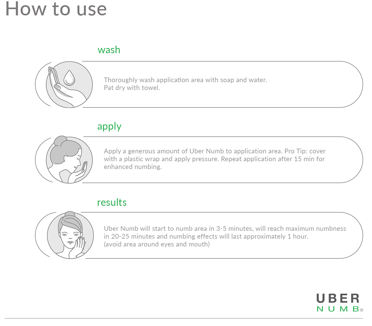Many topical ointments contain up to 4% Lidocaine. But Uber Numb provides a full 5%, the maximum dose permitted without a prescription. What’s more, it combines this extra-strength Lidocaine with propylene glycol, which enhances skin penetration. Result? Your Uber Numb anesthetic cream goes down deep to numb nerve endings & block pain signals. Plus, it absorbs extra-fast, reaches full effect by 20-25 minutes & keeps numbing for up to 1 hour.