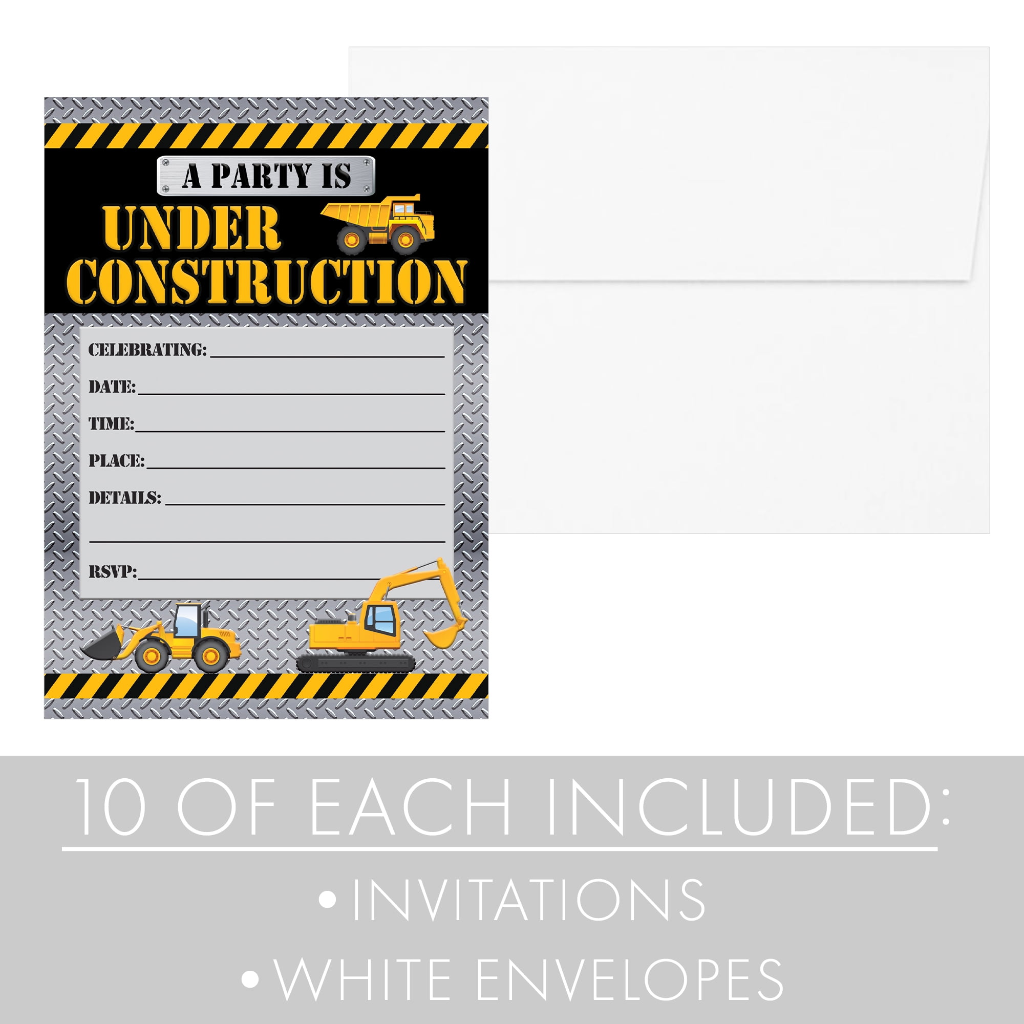 - 10 CARDS WITH ENVELOPES: Under Construction party invitations with envelopes are made to match bulldozer and dump truck birthday party for kids.