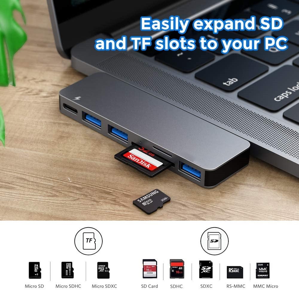 It perfectly expand the 3 USB ports, 1 SD card, 1 TF card, 1 USB-C Charging port on MacBook Pro and satisfy your different needs in the office, school or on travel.