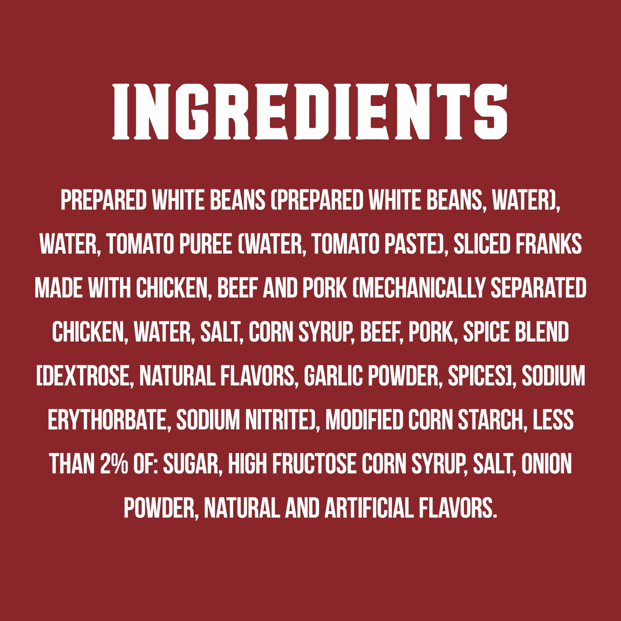 - Indulge in the classic taste of beans in tomato sauce flavored with sliced franks, made from chicken, beef and pork