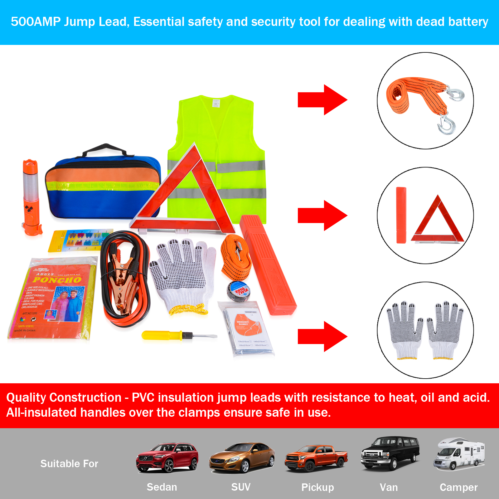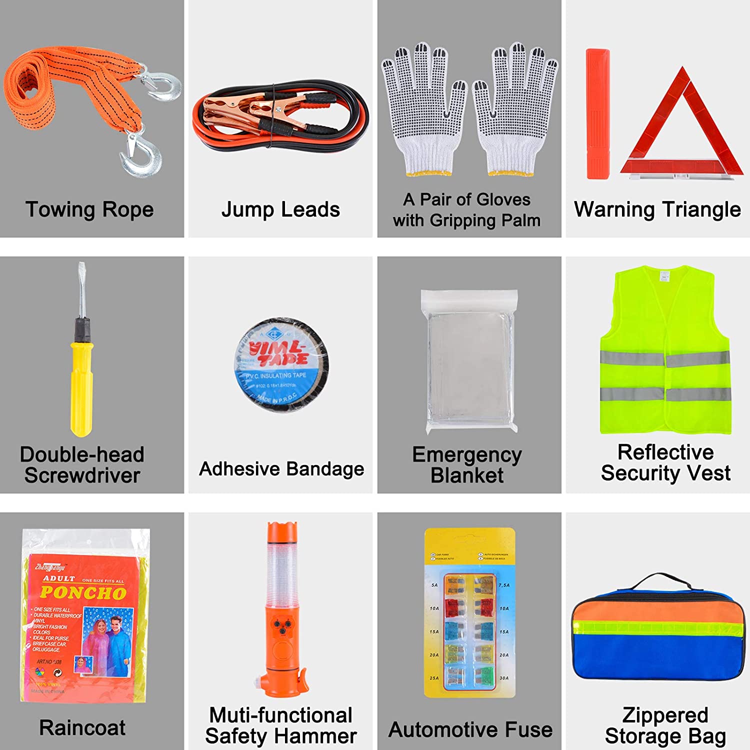 - Multipurpose Car Emergency Kit: This compact and practical roadside emergency kit includes Towing Rope, Jumper Leads, 1 Pair of Glovers with Gripping Palm, Warning Triangle, Double-head Screwdriver, PVC Insulated Tape, Emergency Blanket, Reflective Security Vest, Raincoat, Multifunctional Safety Hammer, Automotive Fuse, Zippered Storage Bag. To help you deal with most of the possible accidents.